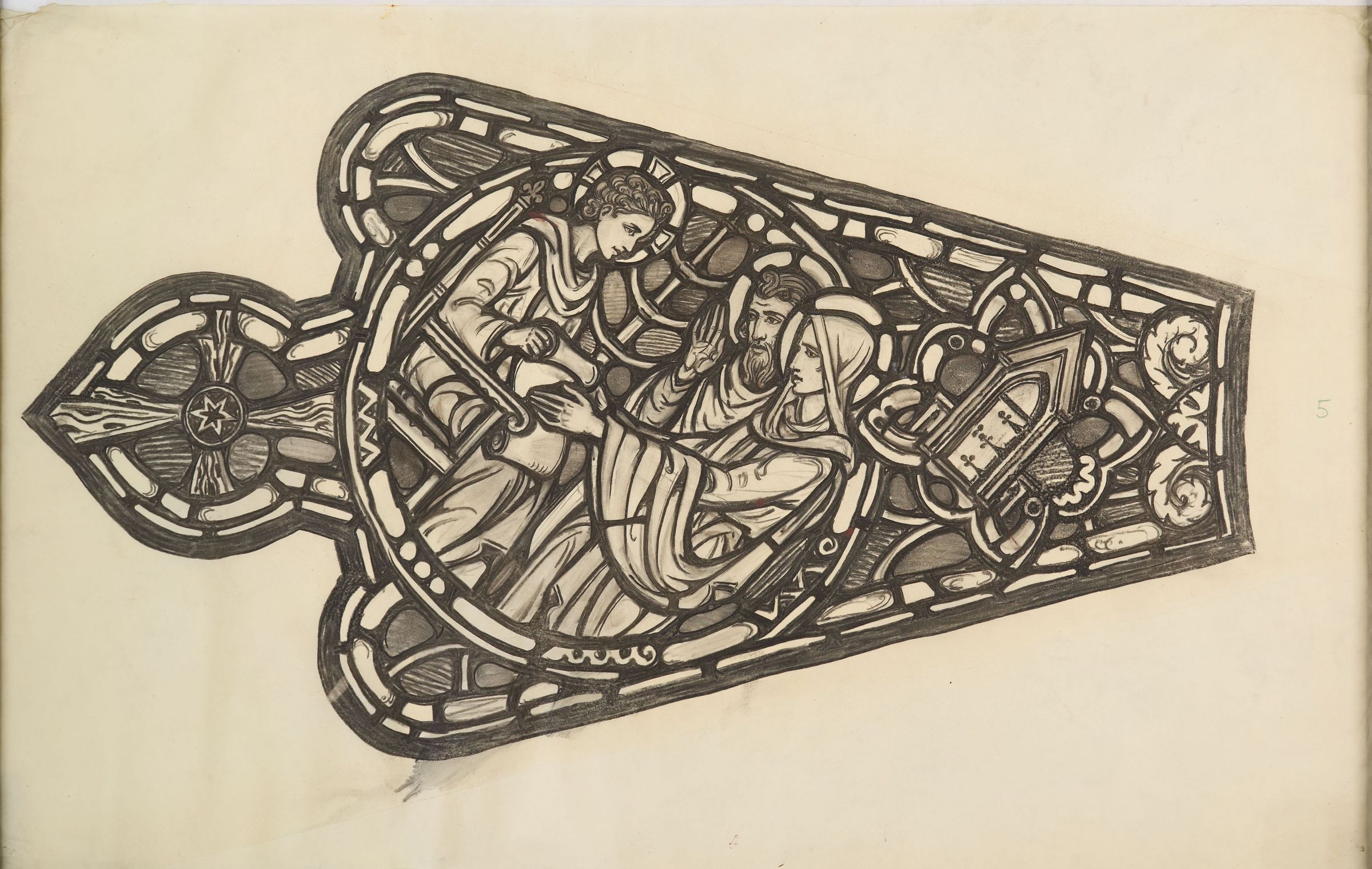 Stained glass scale cartoon, rose window petal for the Children's Rose Window at Rosary Cathedral, Toledo, OH. Depicts Mary and Joseph finding Jesus in the temple.Type of Drawing