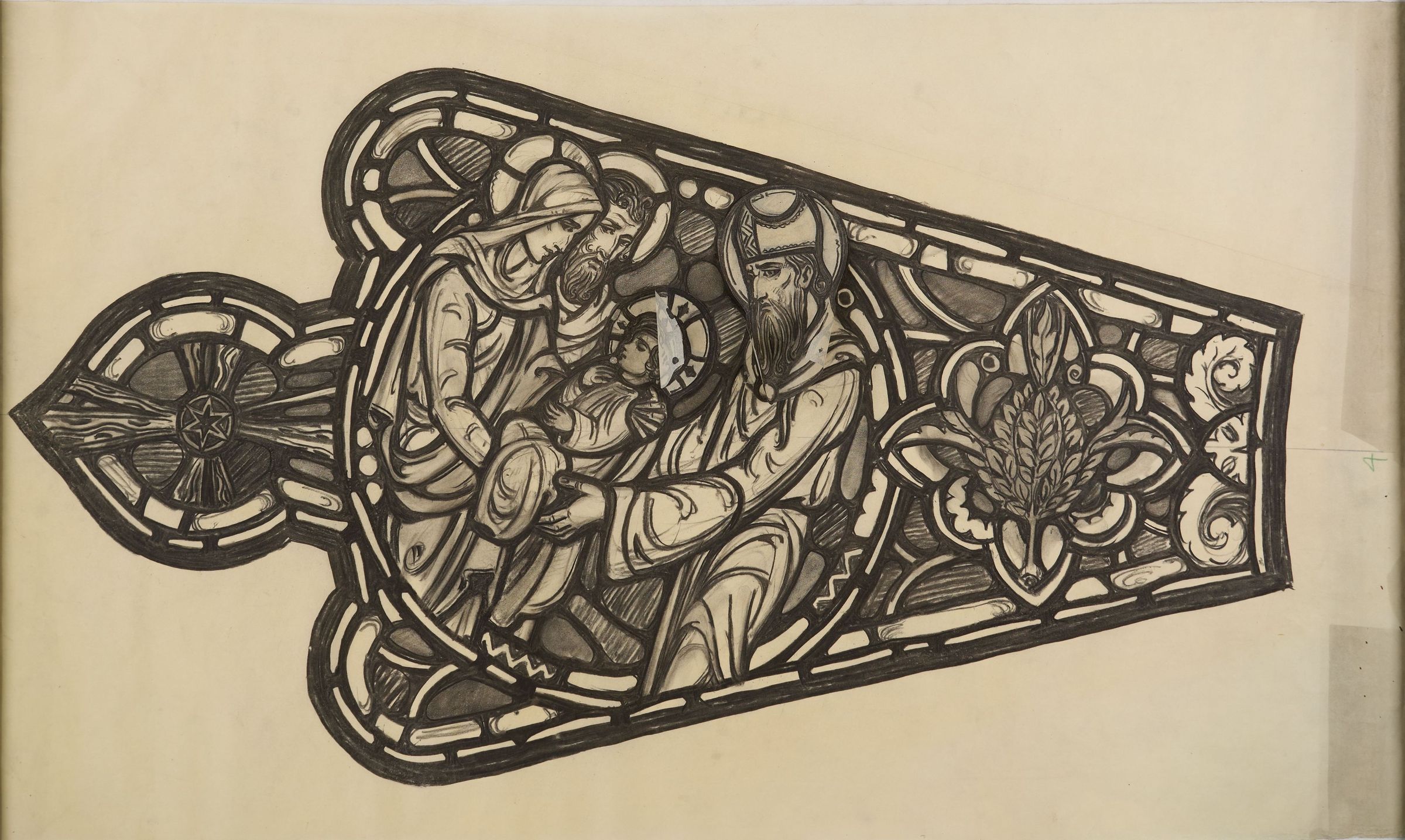 Stained glass scale cartoon, rose window petal for the Children's Rose Window at Rosary Cathedral, Toledo, OH. Depicts Mary and Joseph presenting Jesus in the temple.Type of Drawing