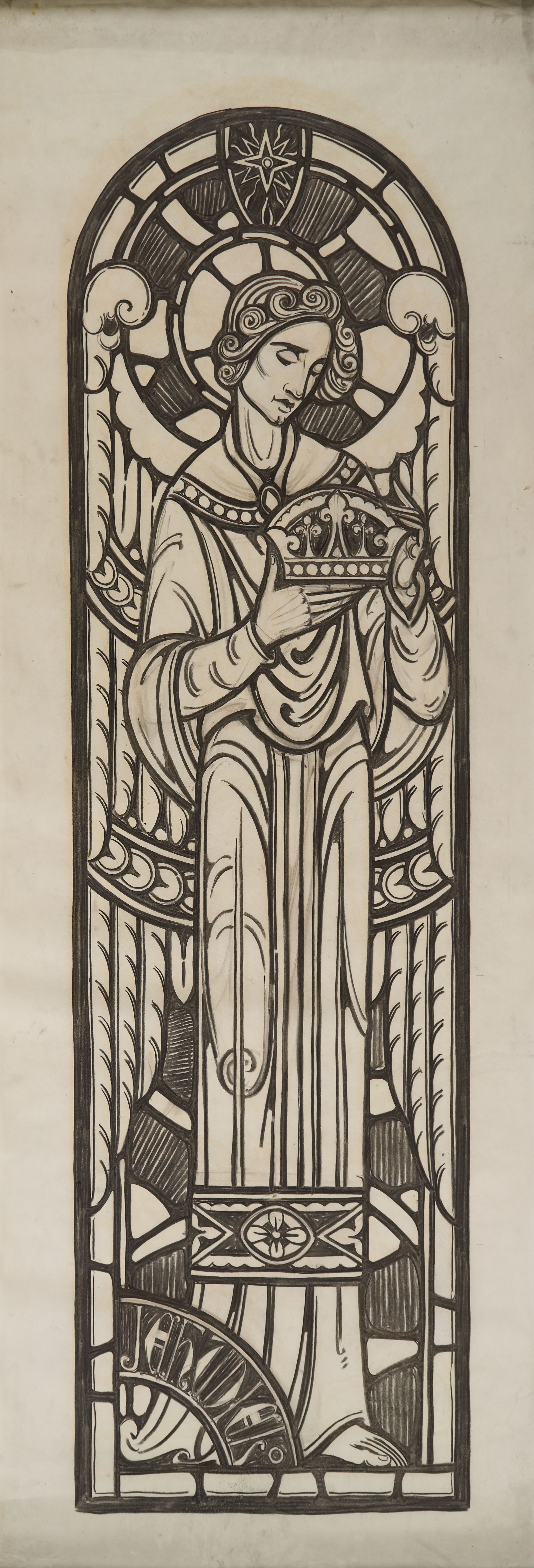 Stained glass scale cartoon, sanctuary window at Rosary Cathedral in Toledo, OH. Depicts the Archangel Jehudiel with a crown.Type of Drawing
