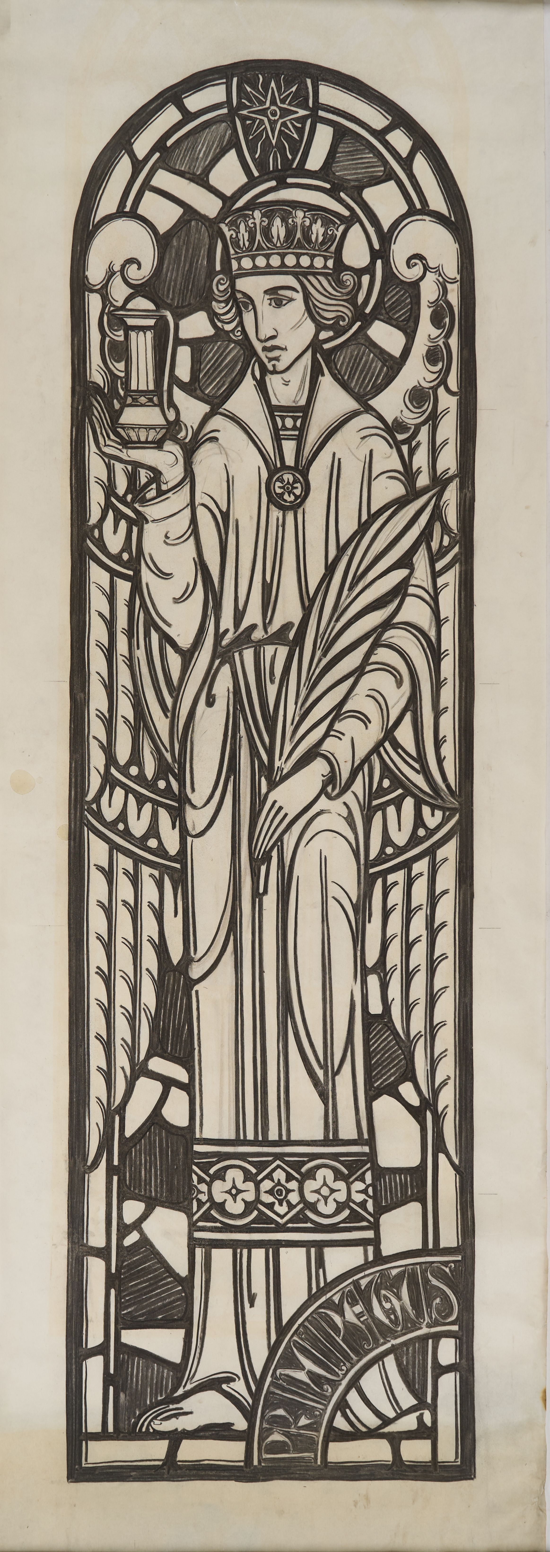 Stained glass scale cartoon, sanctuary window at Rosary Cathedral in Toledo, OH. Depicts the Archangel Principatus with a cruet.Type of Drawing
