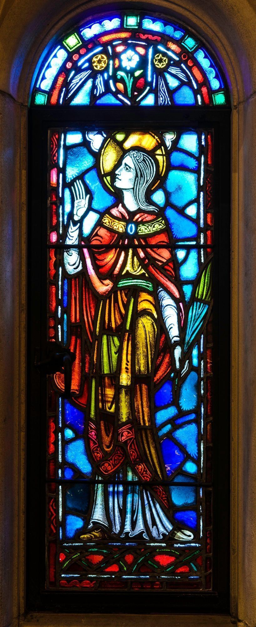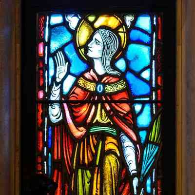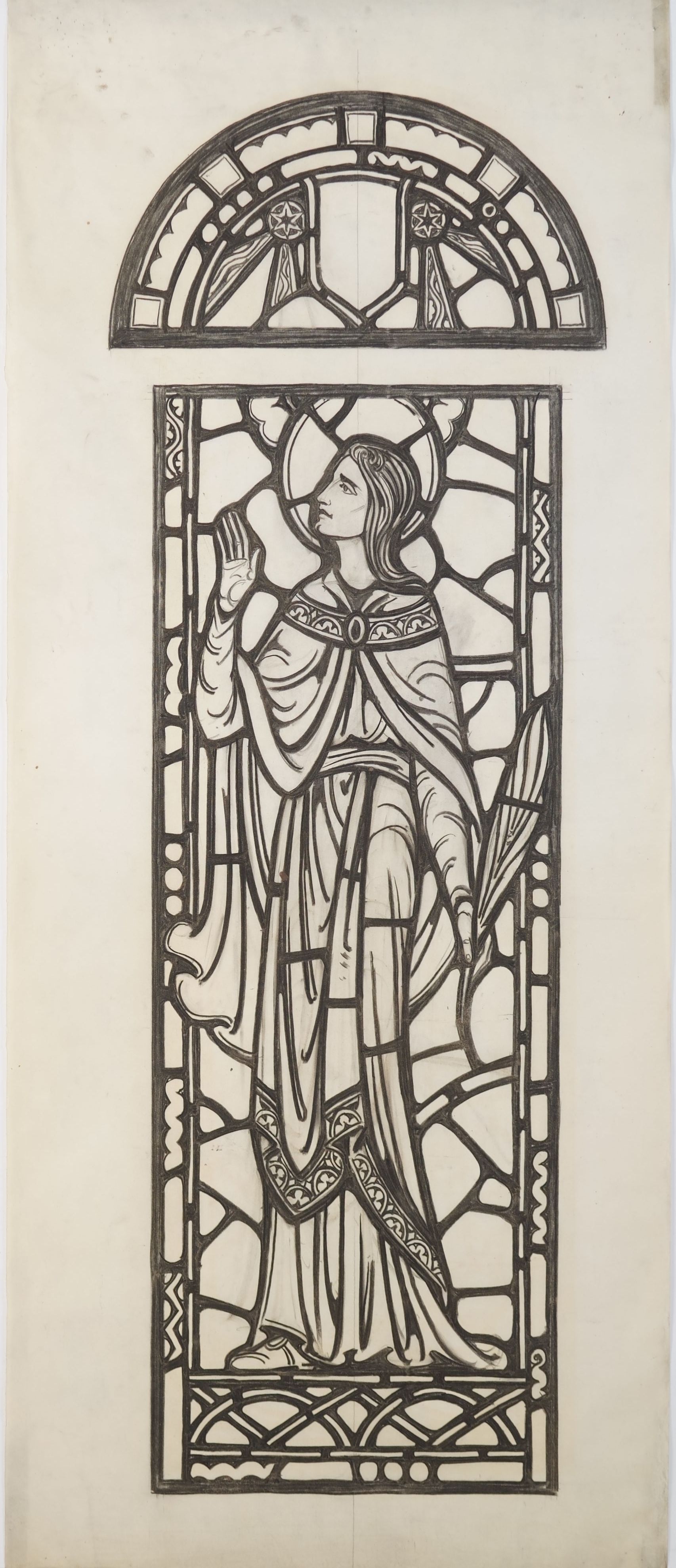 Stained glass scale cartoon, Rose of Lima window in Our Lady, Queen of the Most Holy Rosary Cathedral in Toledo, Ohio. Depicts St. Rose of Lima holding a palm branch, with a lily above her