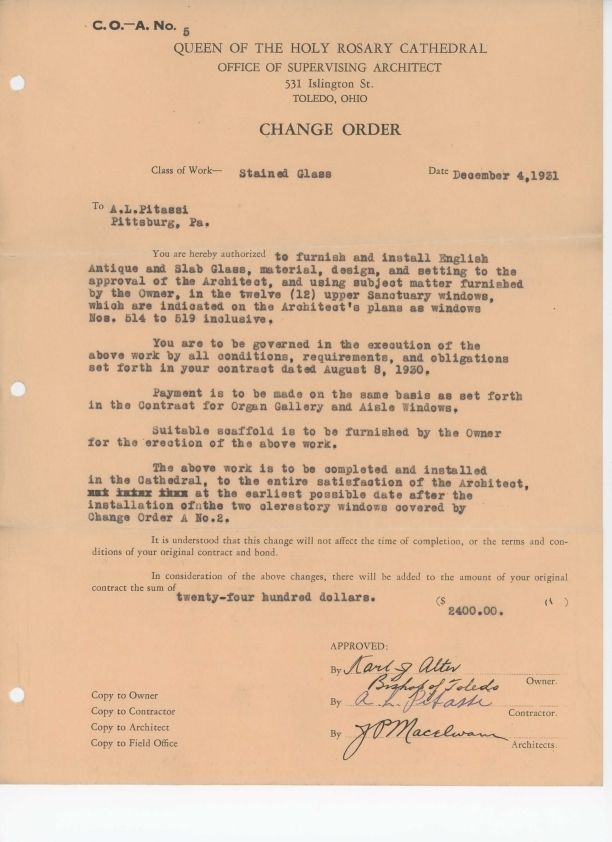 Work order authorizing Leo Pitassi to execute 12 upper sanctuary windows at Our Lady, Queen of the Most Holy Rosary Cathedral in Toledo, OH.Collection