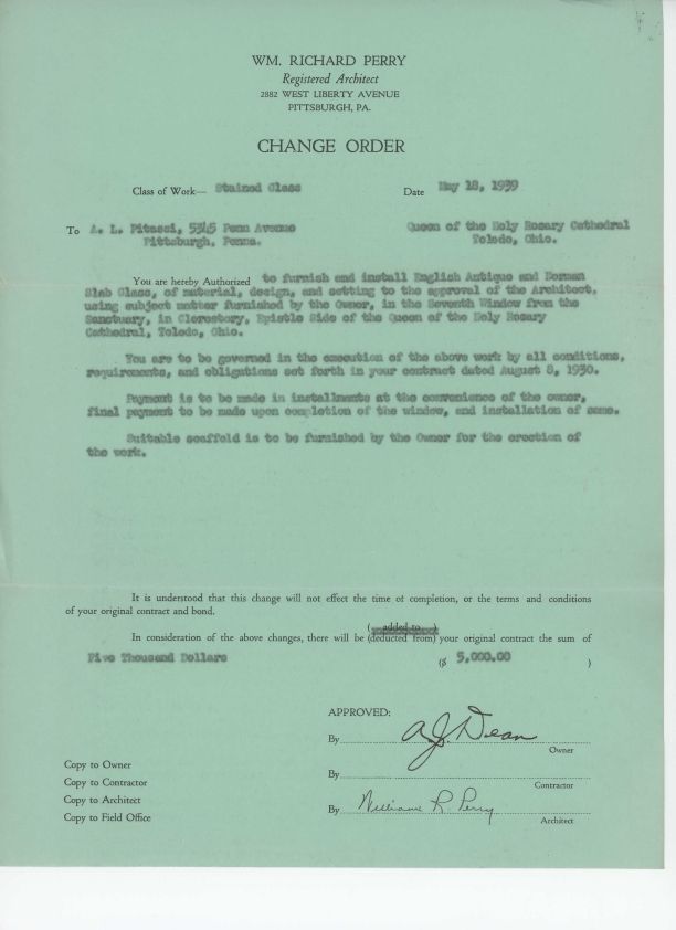 Work order authorizing Leo Pitassi to execute clerestory window at Our Lady, Queen of the Most Holy Rosary Cathedral in Toledo, OH.Collection