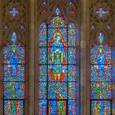 Stained glass scale cartoon, left light of Youth aisle window in Our Lady, Queen of the Most Holy Rosary Cathedral in Toledo, Ohio. Depictions from top to bottom: St. John Berchmans holding a cross; an unknown child saint with a monk and bishop; St. John Berchmans with a rosary.