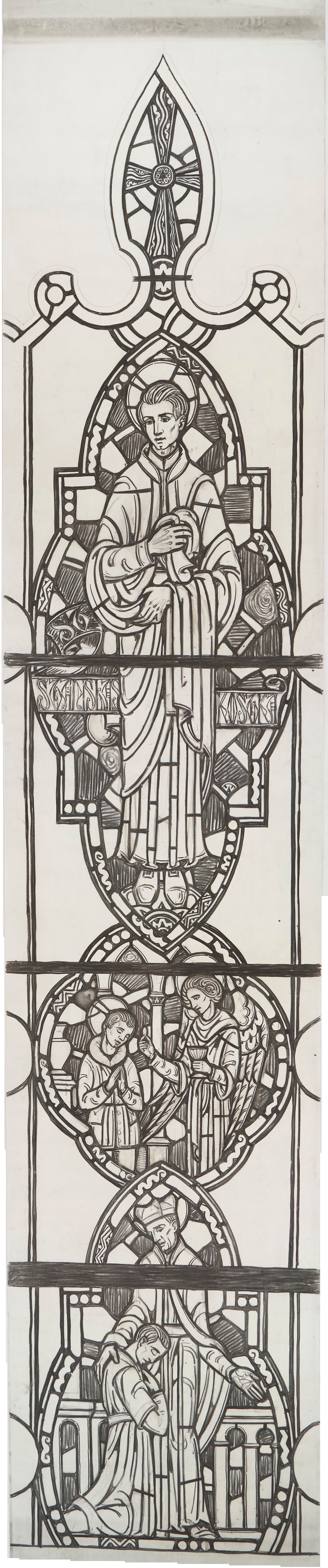 Stained glass scale cartoon, right light of Youth aisle window in Our Lady, Queen of the Most Holy Rosary Cathedral in Toledo, Ohio. Depictions from top to bottom: St. Stanislaus Kostka with a wet linen; St. Stanislaus given the Eucharist by an angel; St. Stanislaus with unknown man.