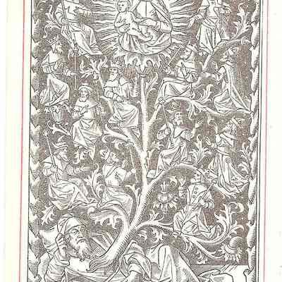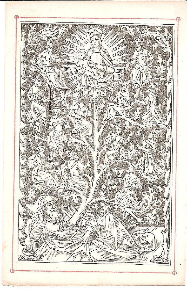 This is a reproduction of a 16th century engraving of the Tree of Jesse. It is a visual representation of Jesus' genealogy which dates back to the father of David who was Jesse. This is 3 out of 4 of the same print.