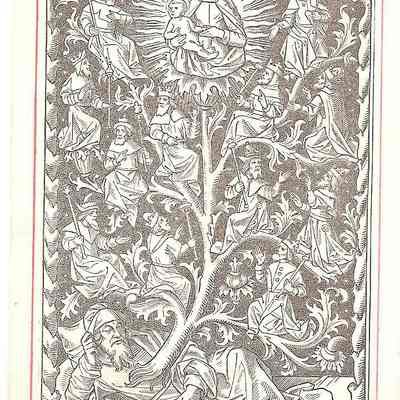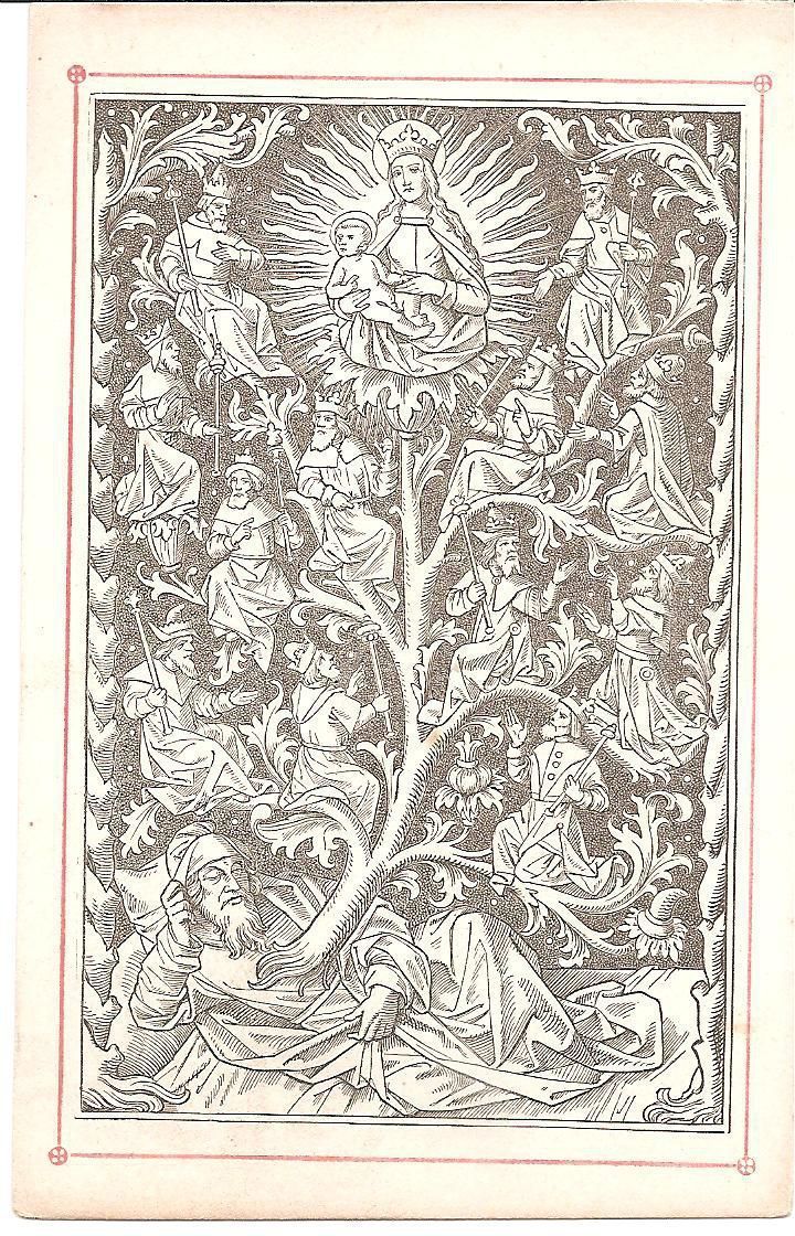 This is a reproduction of a 16th century engraving of the Tree of Jesse. It is a visual representation of Jesus' genealogy which dates back to the father of David who was Jesse. This is 2 out of 4 of the same print.