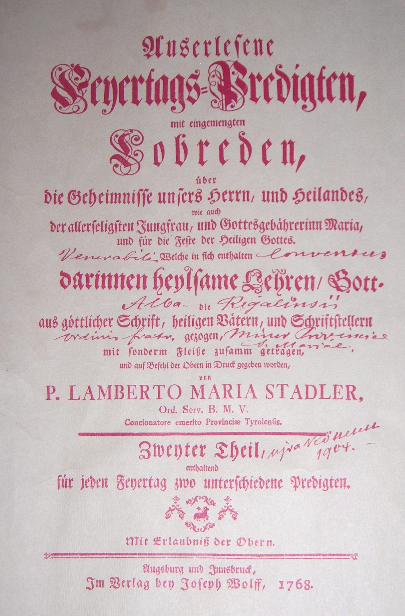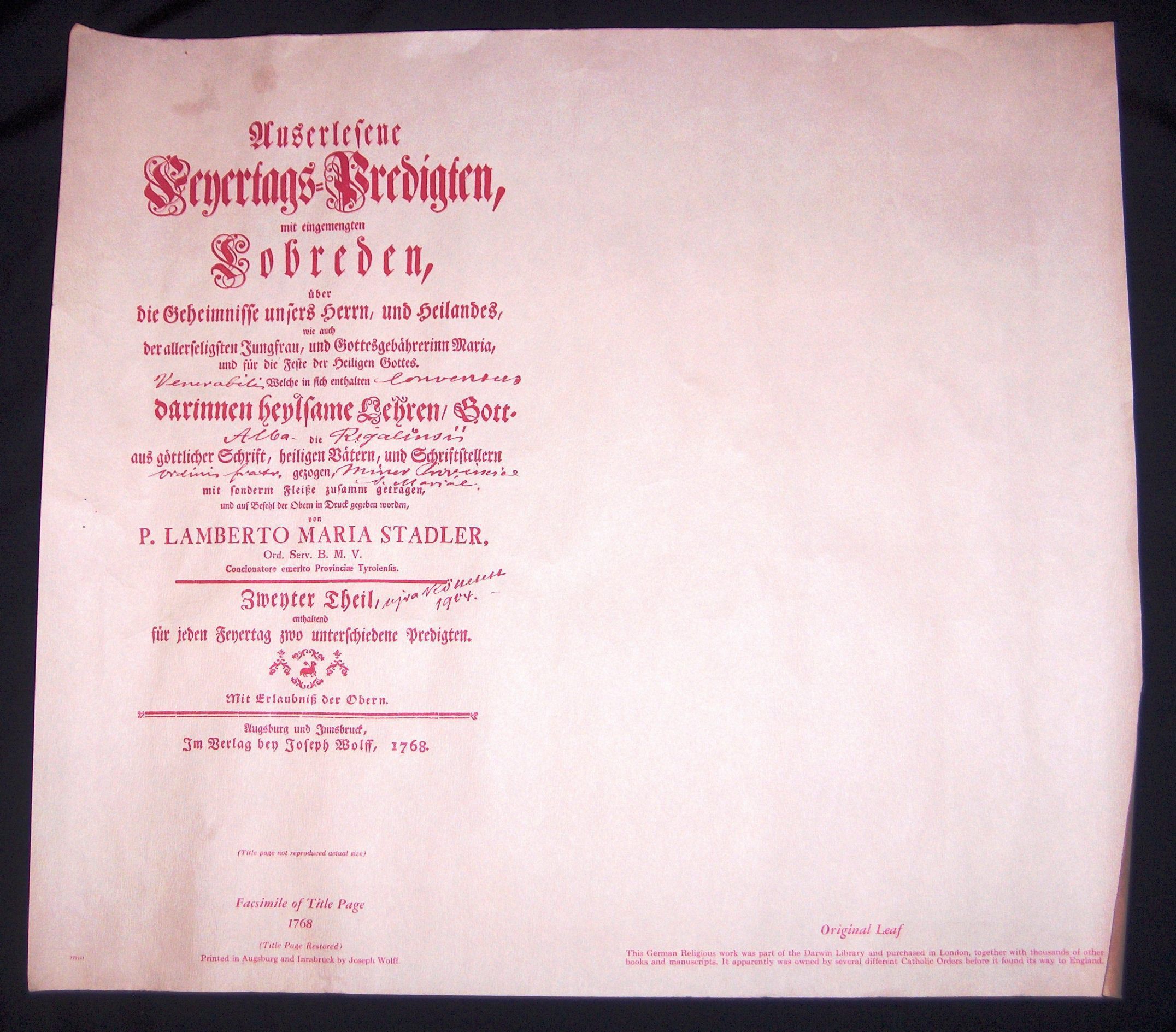 This German Religious work was part of the Darwin Library and purchased in London, together with thosands of other books and manuscripts. it apparently was owned by several different Catholic Orders before it found it's way to England. It was then purchased by the Saint Vincent ArchabbeyGeneral Notes