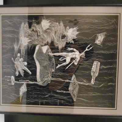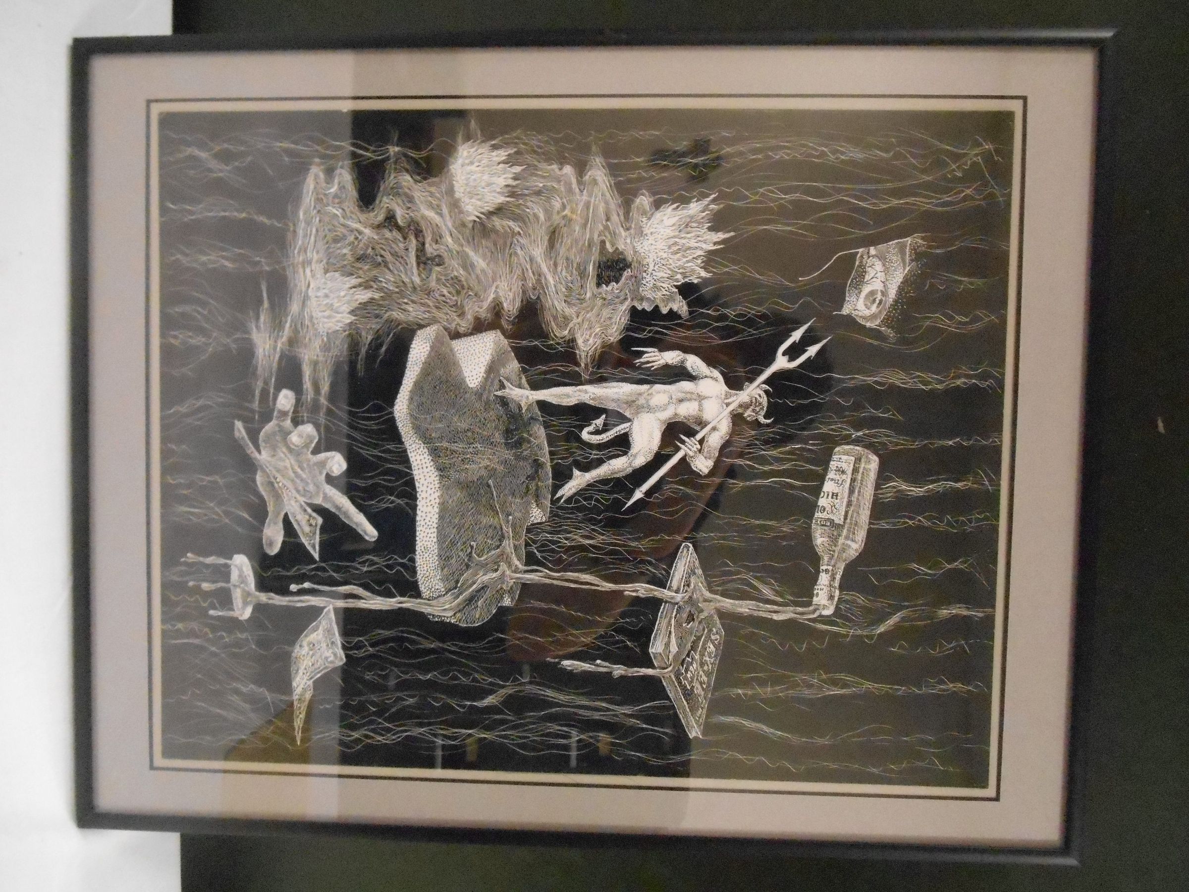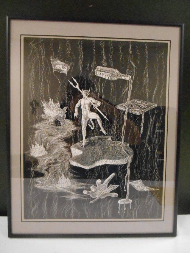 White etching over a black background. this piece Depicts the devil with many of the vices such as money, sex, alcohol, etc. Please note that the acsession number does not indicate the year the piece was added to the collection, but the year it was inventoried.Artwork Details