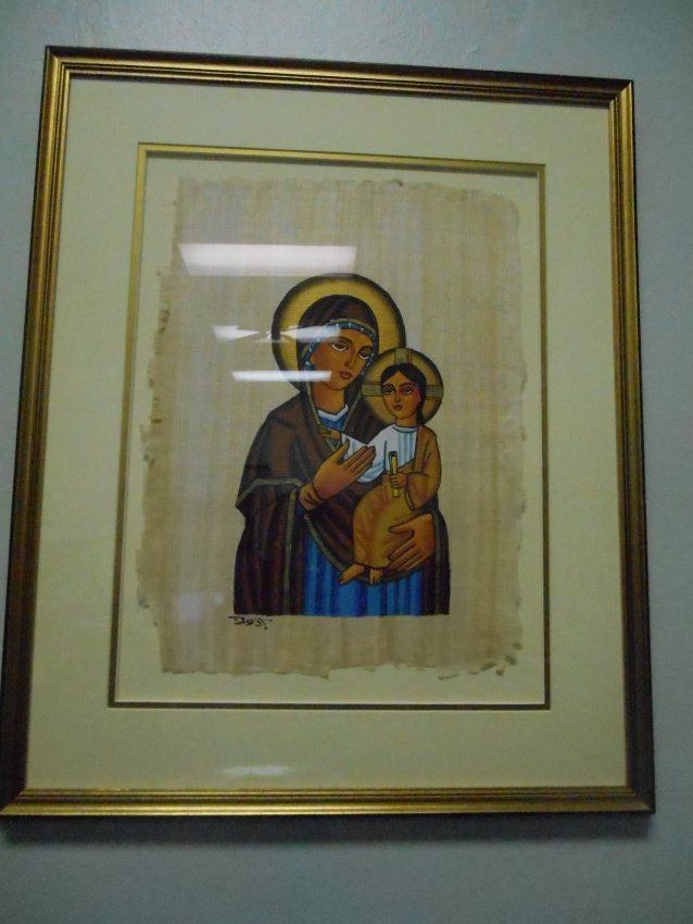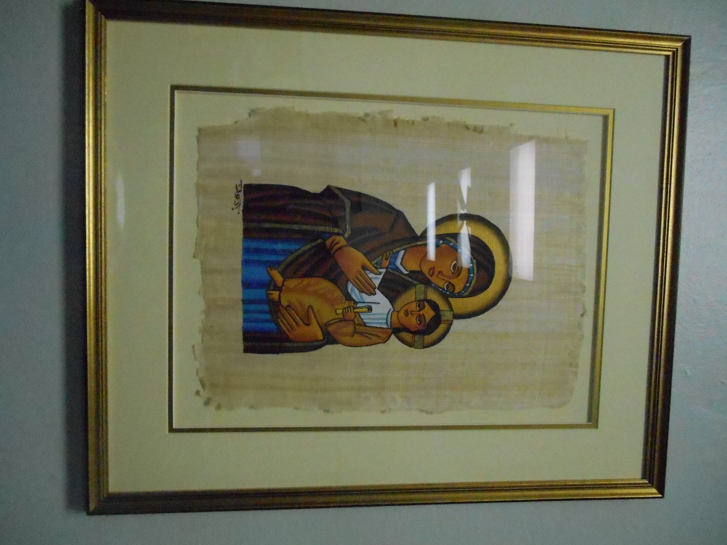 Icon-like Painting of Mary holding Jesus. Painted on some sort of pressed plant. Possible Papyrus. Due to lack of information, the accession number indicates the date of inventory not the date of acquesition.Artwork Details