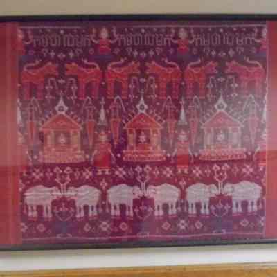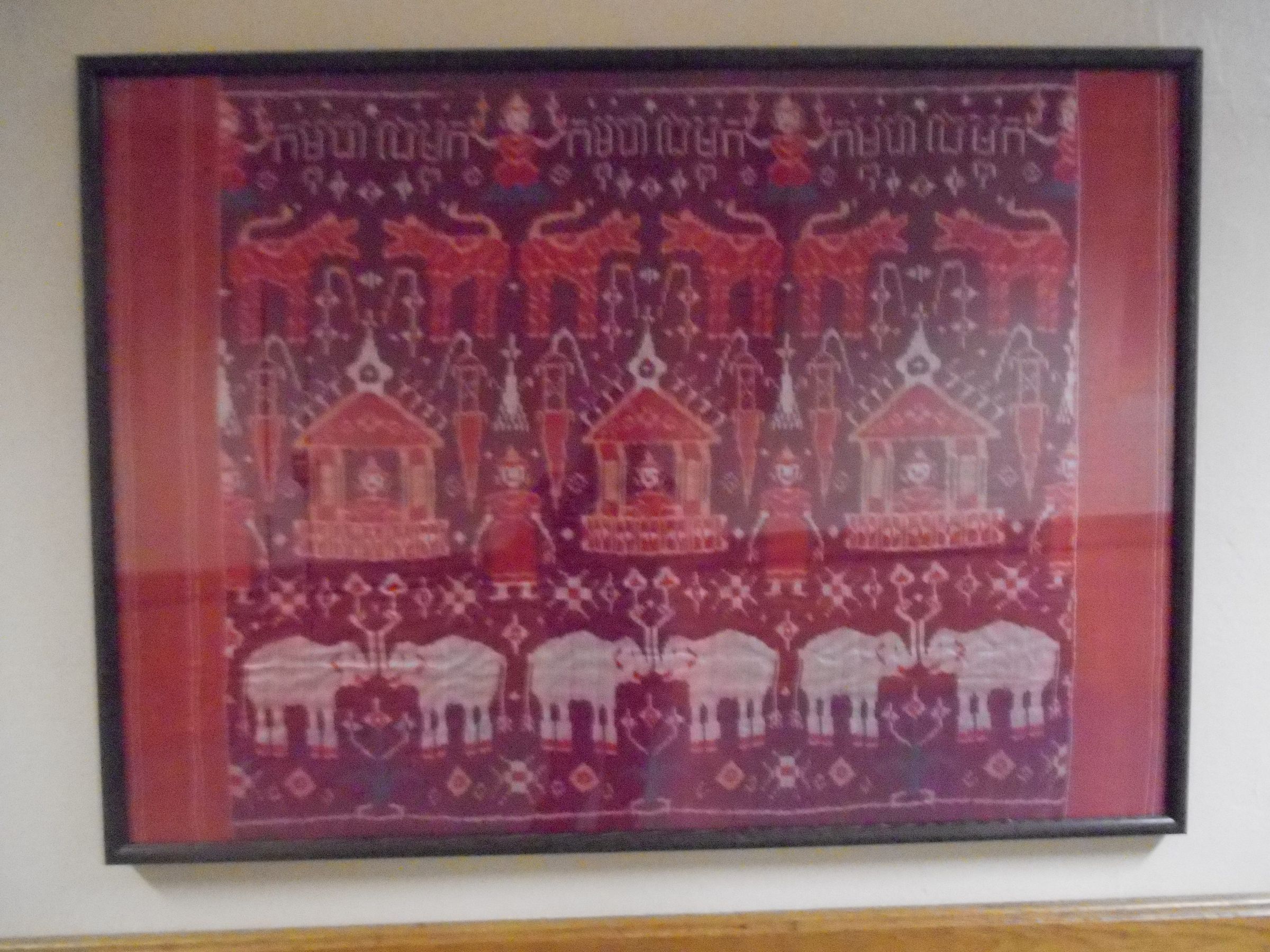 Woven tapestry depicting elephants and human figures. Red and purple thread. looks to be of indian originArtwork Details