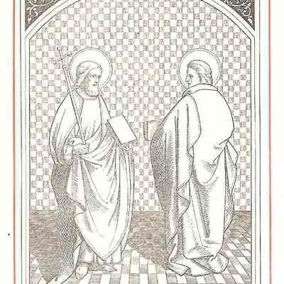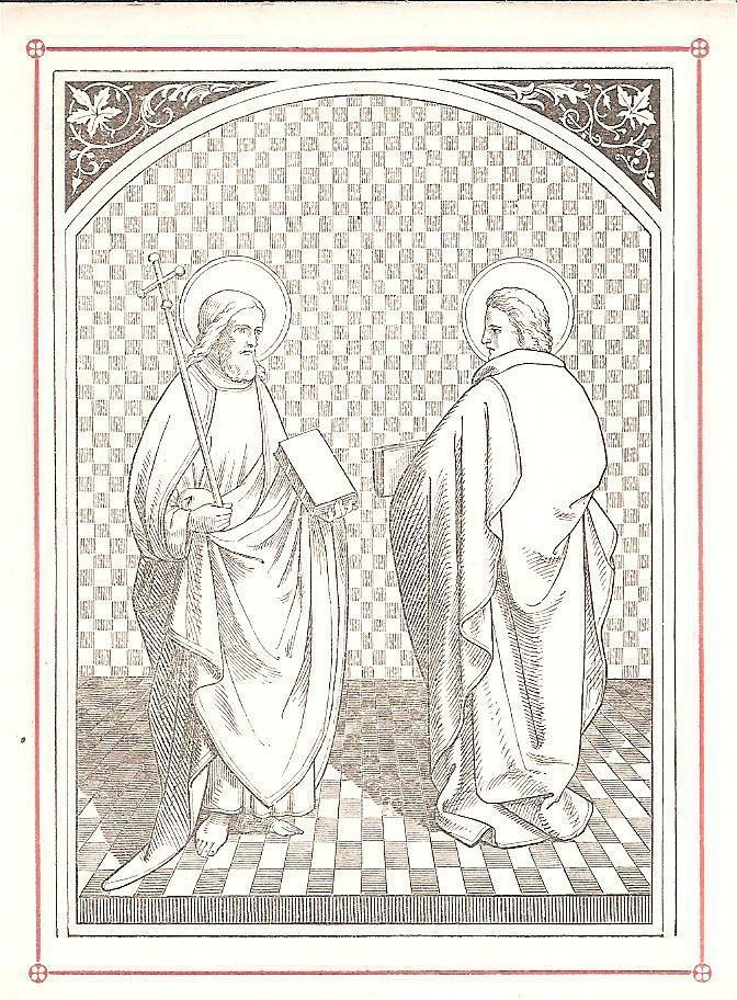 This is a reproduction of a 16th century engraving of two unknown saints. It is a possibility that this is a representation of Saints Cosmas and Damian but this is unlikely because of the fact that they were twins and the man on the left clearly looks younger than the man on the right. Another possibility is that the man on the left is Saint Benedict of Nurisa because he is usually represented with a staff and a book, either way it is unknown. This is 3 out of 5 of the same print.