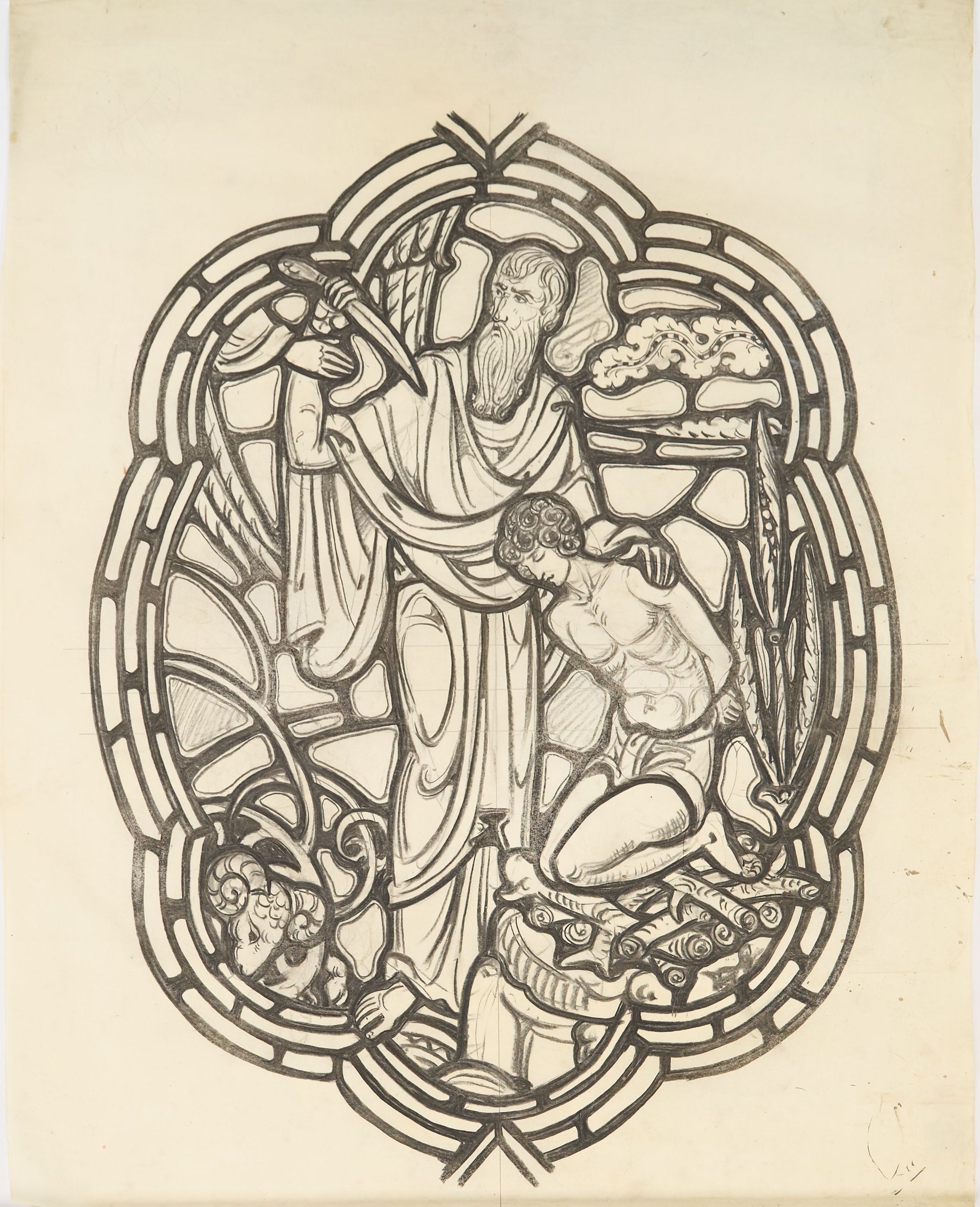 Stained glass scale cartoon, unknown site. Medallion for aisle window, depicting God stopping Abraham from killing Isaac. A ram is seen to the left of Abraham.Type of Drawing