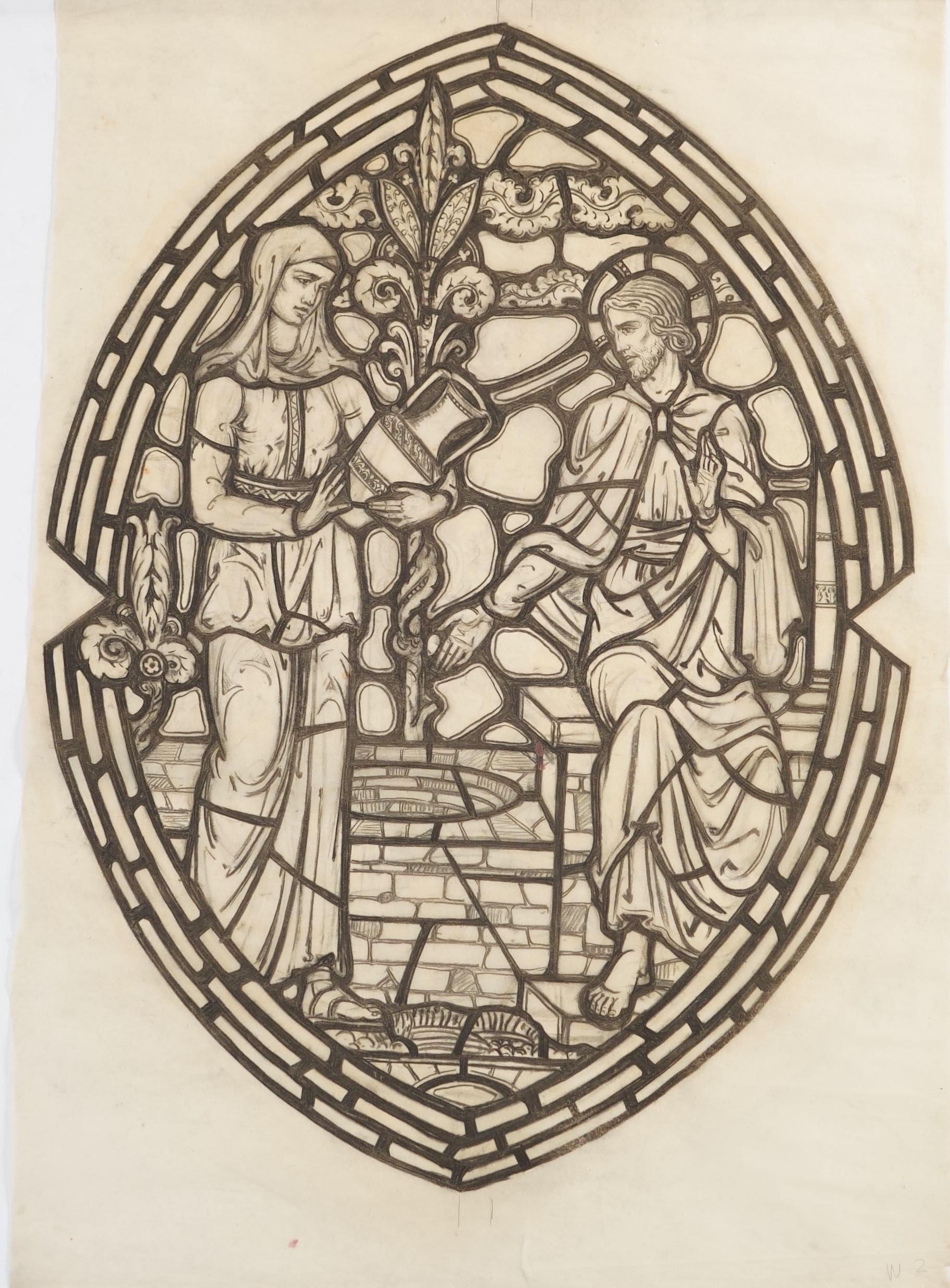 Stained glass scale drawing, medallion for aisle window, unknown site. Depicts Christ at the well speaking to the Samaritan woman.Type of Drawing