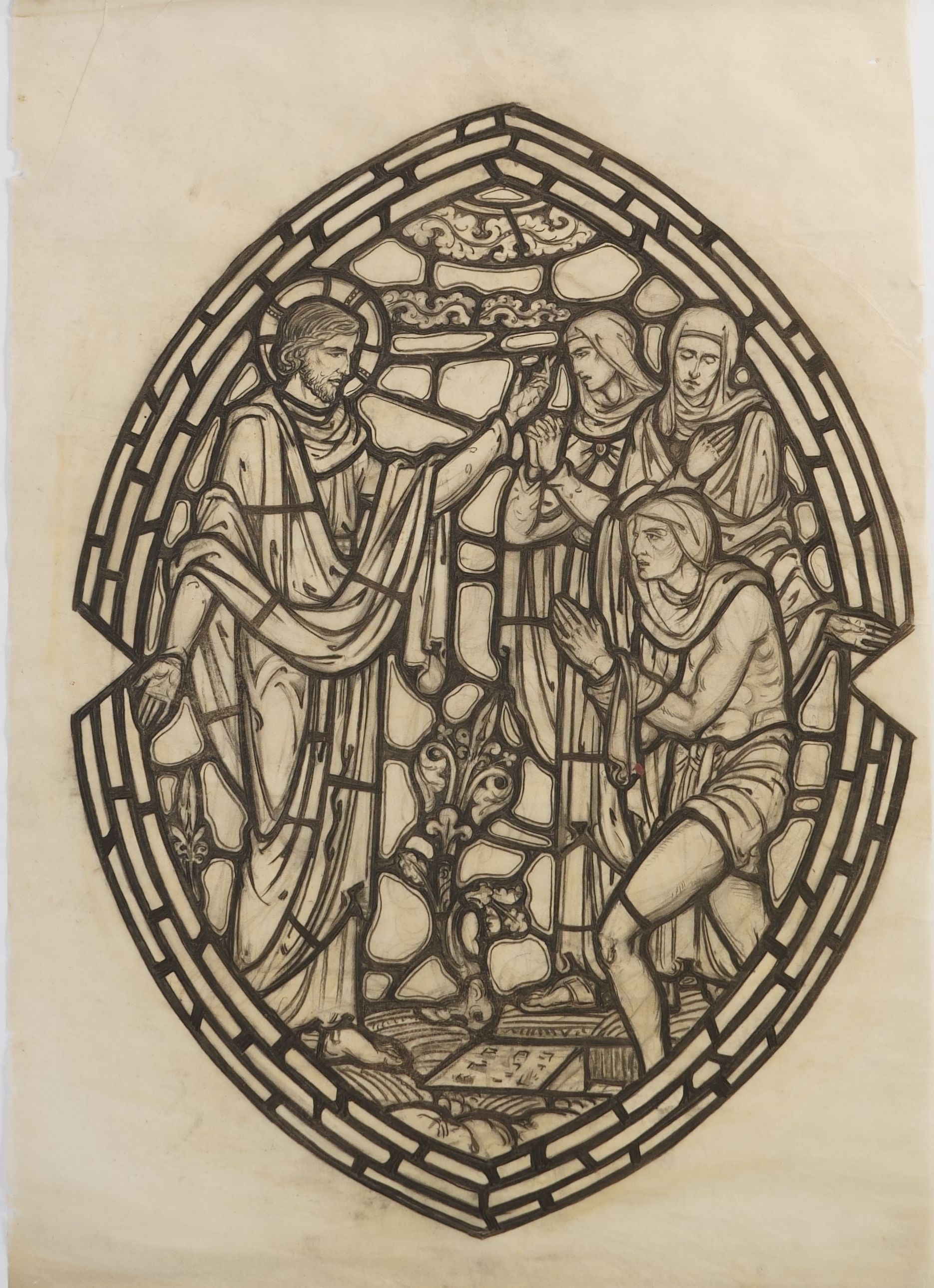 Stained glass scale cartoon, medallion for aisle window, unknown site. Depicts Christ commanding the invalid at the pool at Bethesda to walk.Type of Drawing