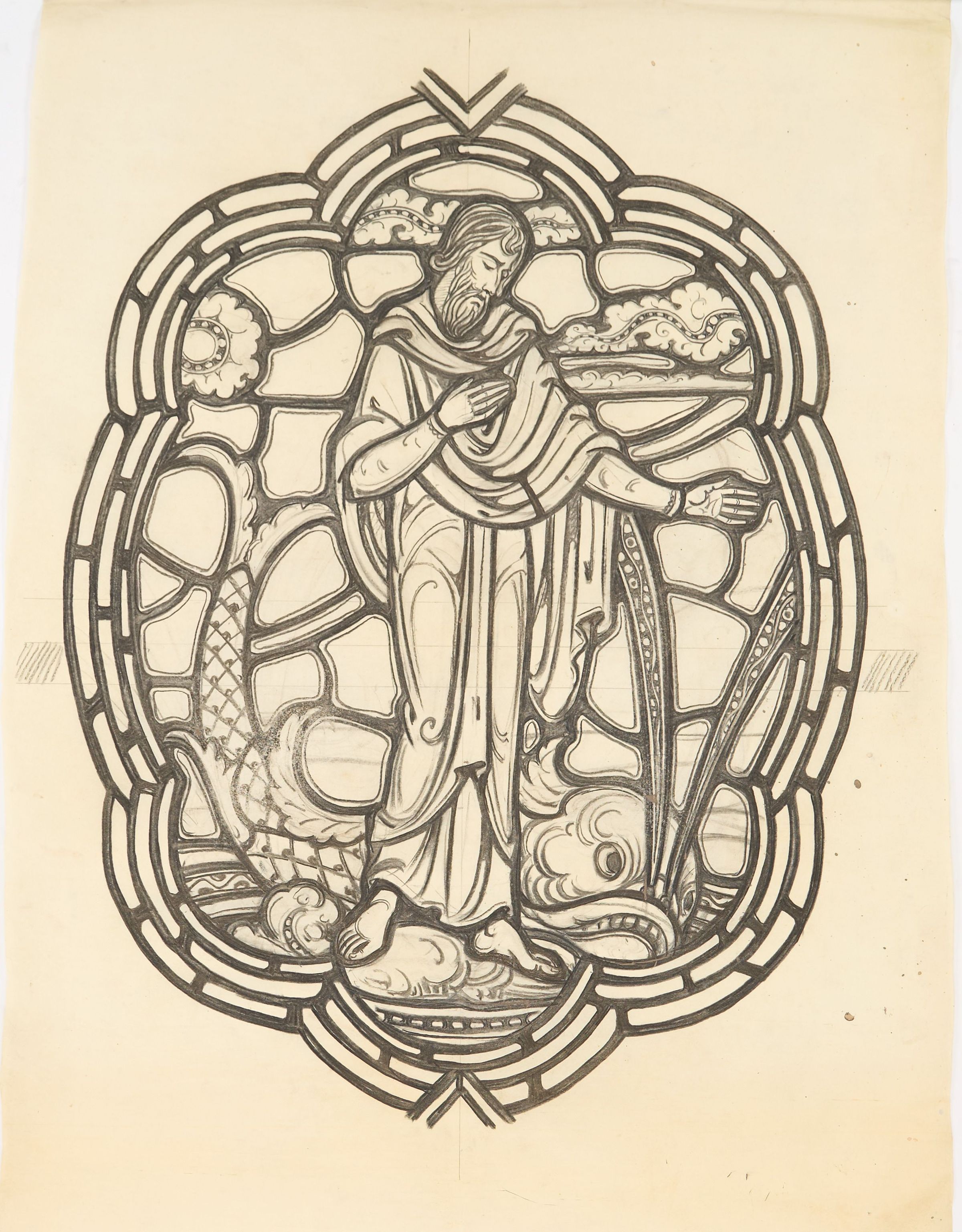 Stained glass scale cartoon, unknown site. Medallion for aisle window, depicting Jonah and the Big Fish.Type of Drawing