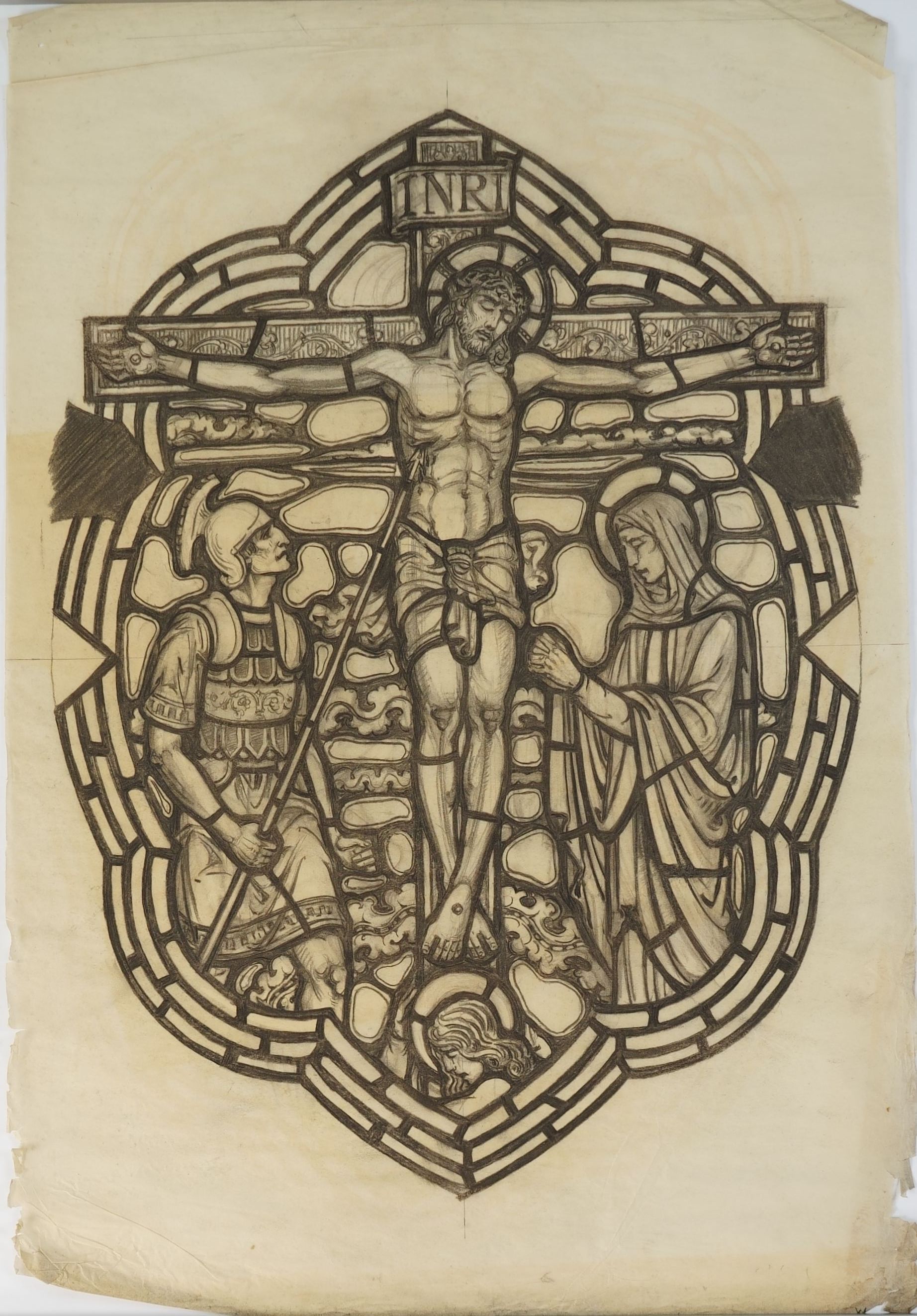 Stained glass scale cartoon, medallion for aisle window, unknown site. Depicts Longinus the Centurion piercing the side of Christ on the cross.Type of Drawing