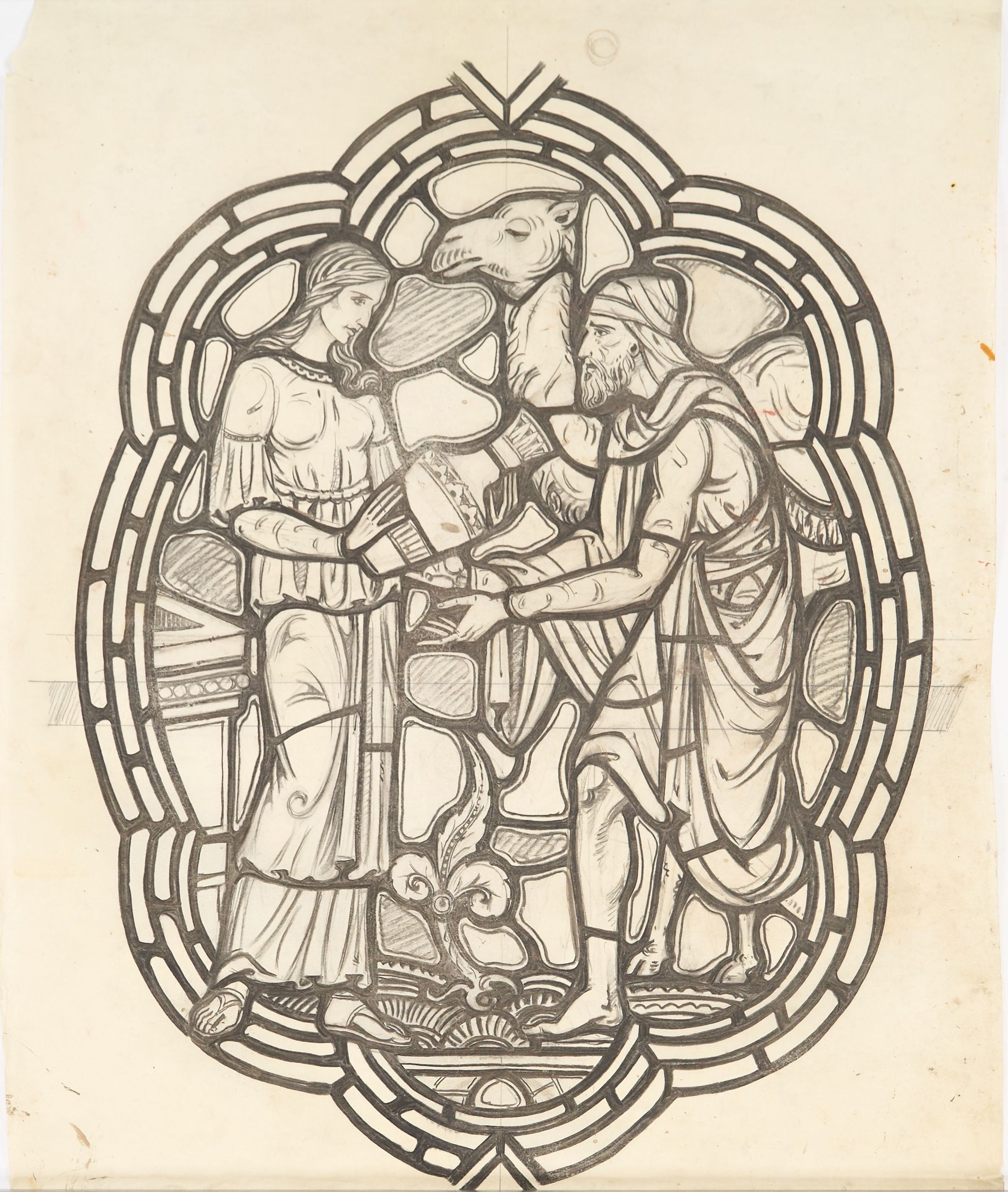 Stained glass scale cartoon, unknown site. Medallion for aisle window, depicting Rebecca holding a jar and Isaac with a camel (Genesis 24).Type of Drawing