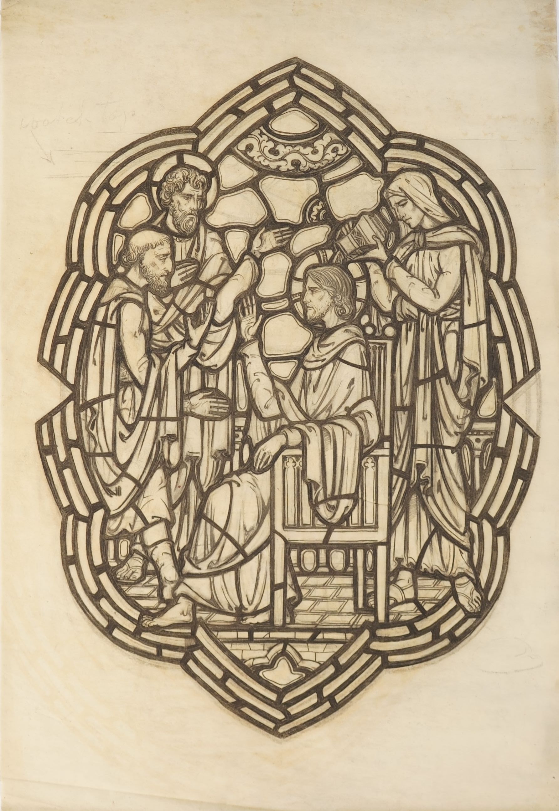 Stained glass scale cartoon, aisle window medallion from an unknown site. Depicts the anointing of Christ by Mary of Bethany in the house of Simon the Leper.Type of Drawing