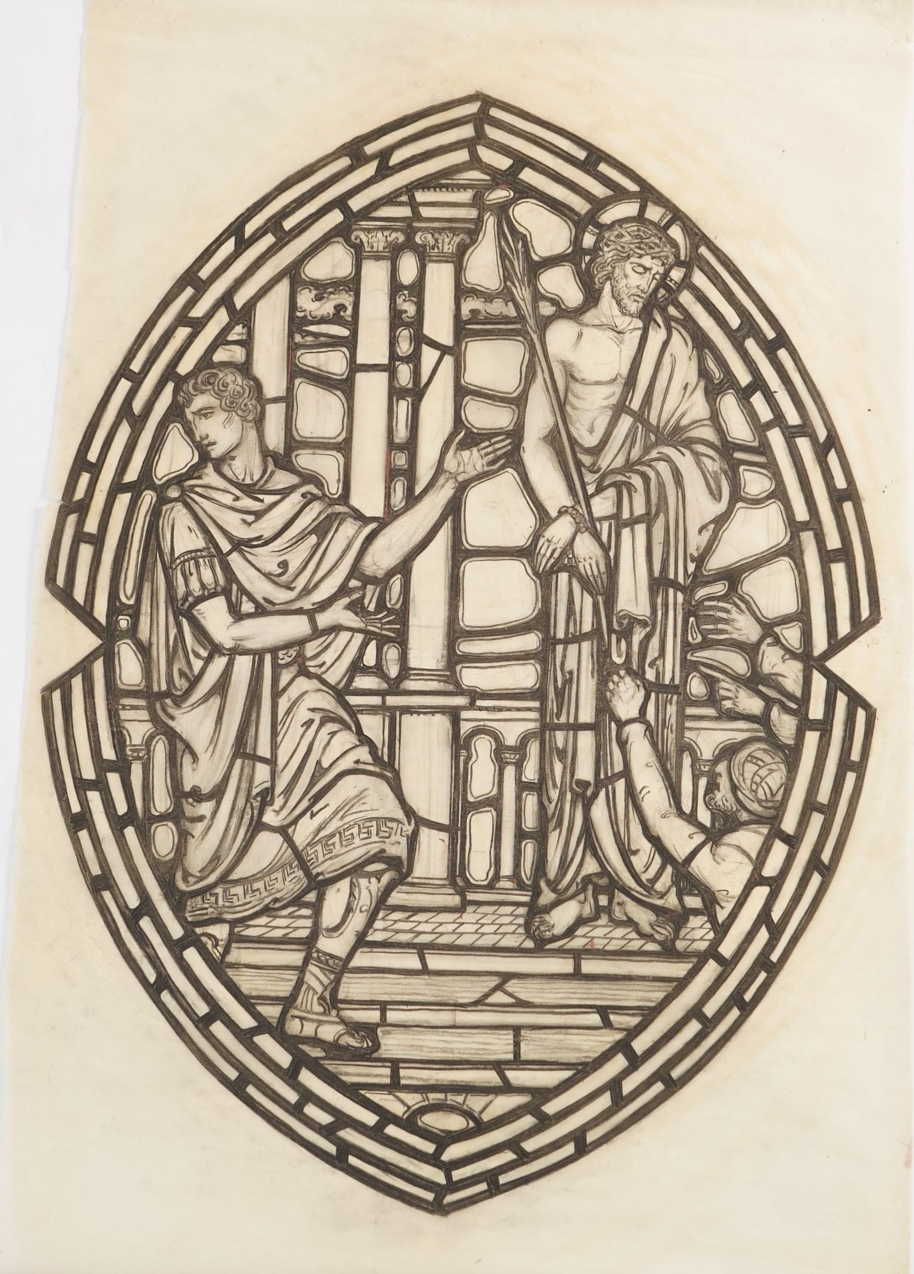 Stained glass scale cartoon, medallion for an aisle window, unknown site. Depicts the mocking of Christ during the PassionType of Drawing