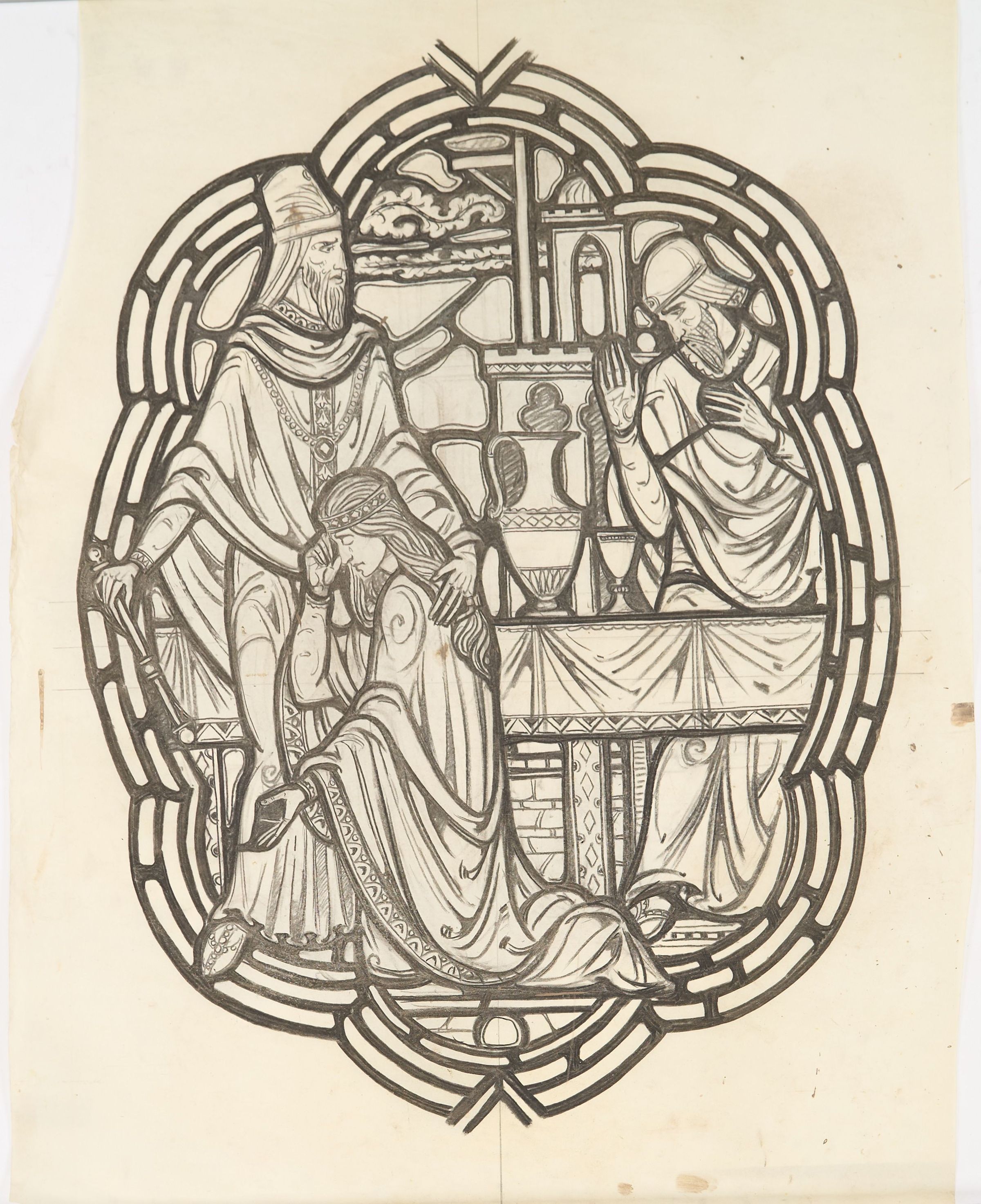 Stained glass scale cartoon, unknown site. Medallion for aisle window, depicting a woman crying and kneeling before a man. The man holds a rod. Another man behind table appears to bow or apologize.Type of Drawing