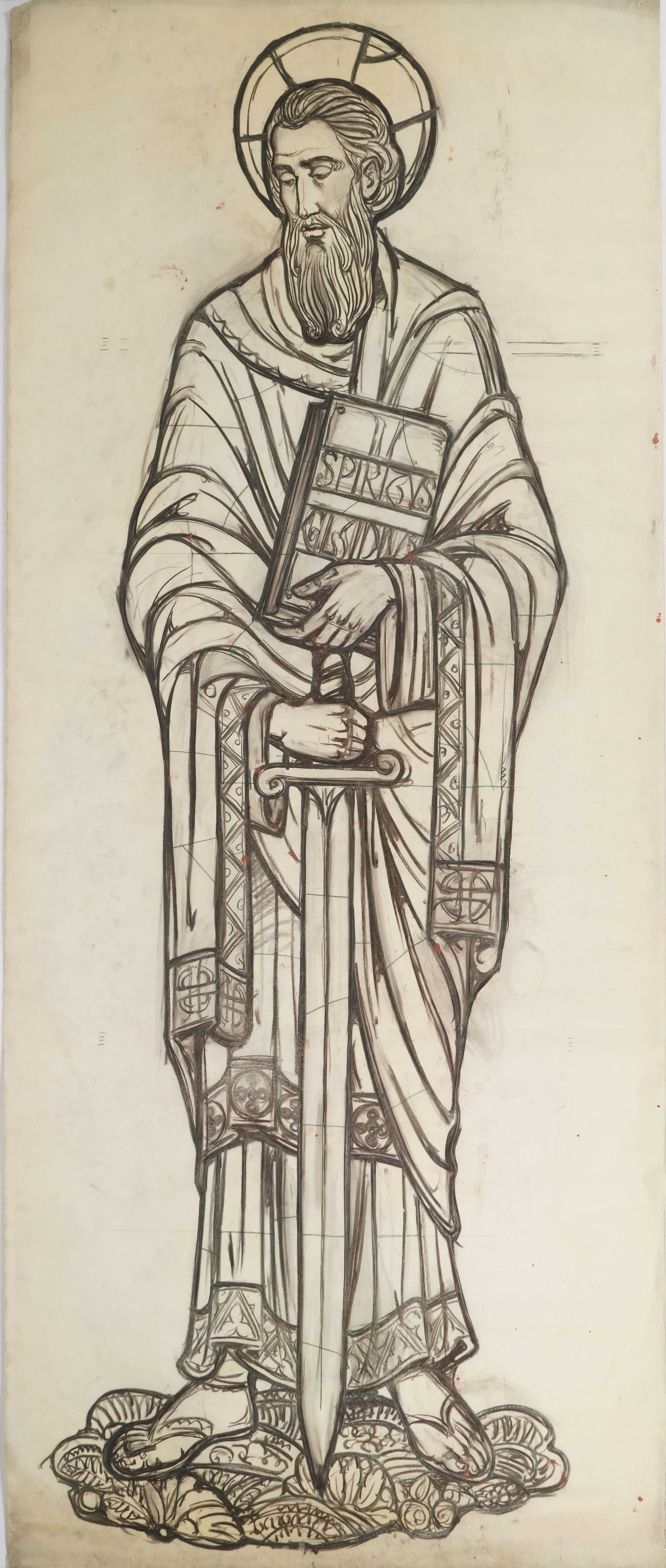 Stained glass scale cartoon, aisle window from unknown site. Depicts St. Paul with a sword and a Bible. The cover of the Bible says "SPIRITUS GLADIUS" meaning "Sword of the Spirit" (Ephesians 6:17).Type of Drawing