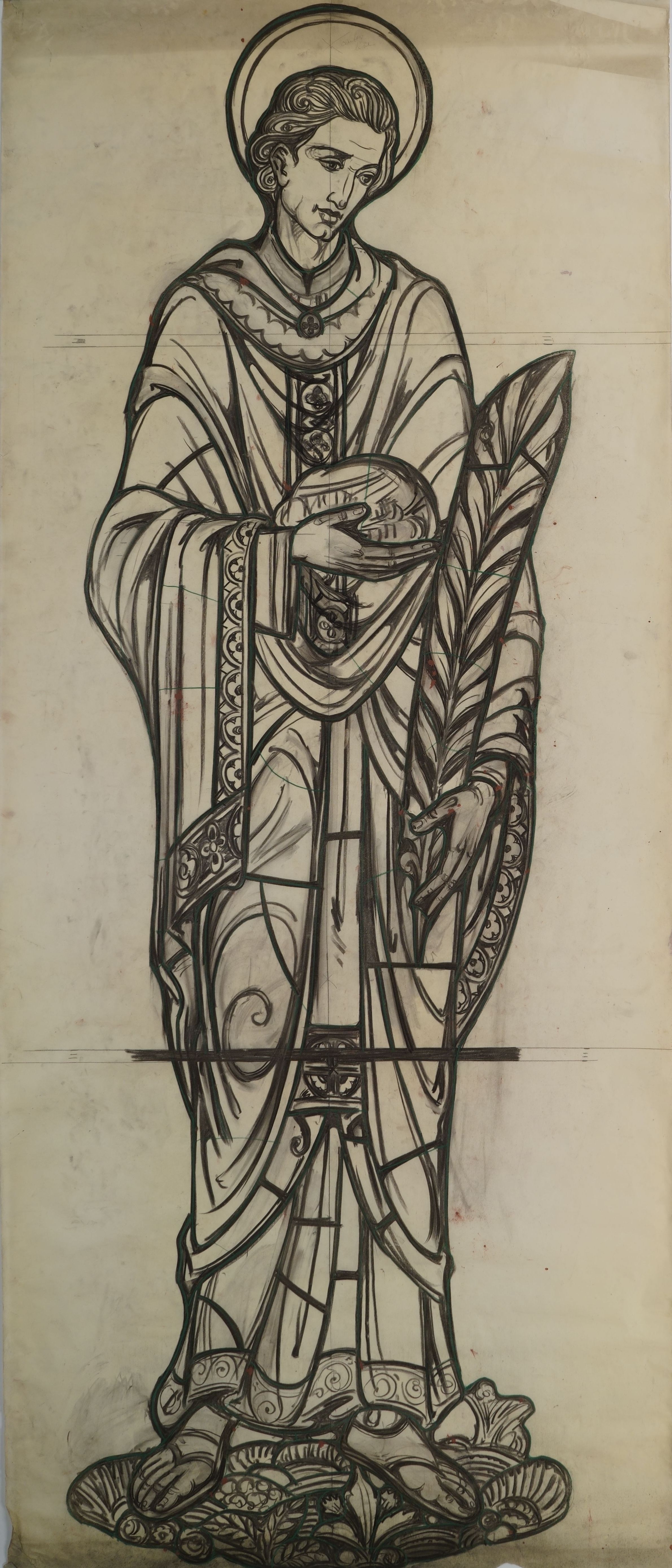 Stained glass scale cartoon, aisle window for St. Stephen Catholic Church in Hazelwood, Pittsburgh, PA. Depicts St. Stephen with a stone and palm leaf.Type of Drawing