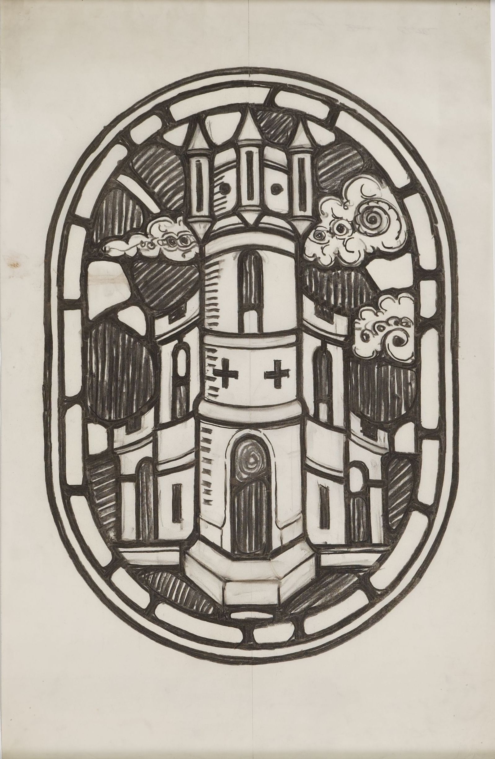 Stained glass scale cartoon; unknown site. A medallion; depicts a castle tower.Type of Drawing