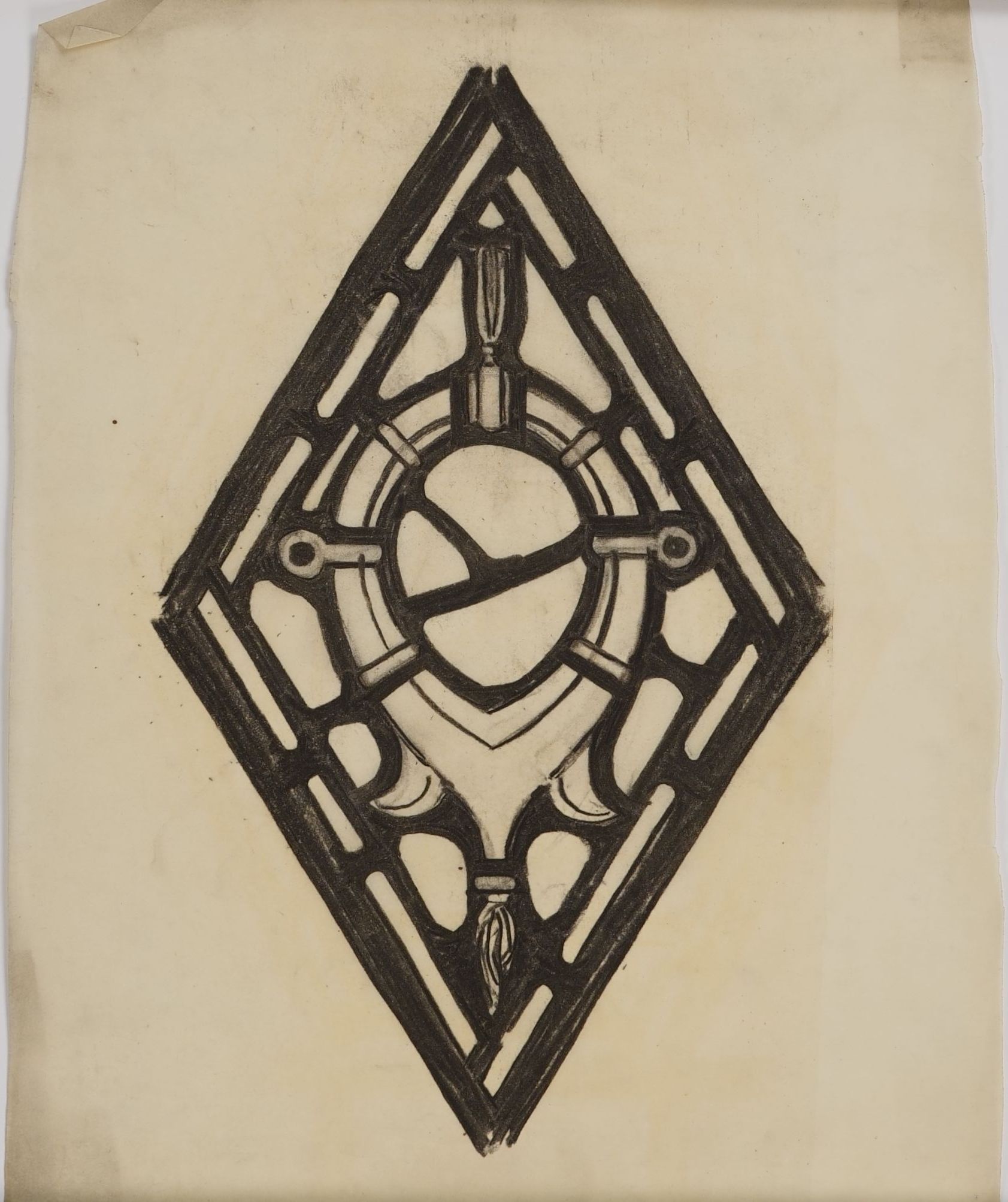 Stained glass scale cartoon, window medallion for unknown site. Depicts a fishing net pulley or yoke.Type of Drawing