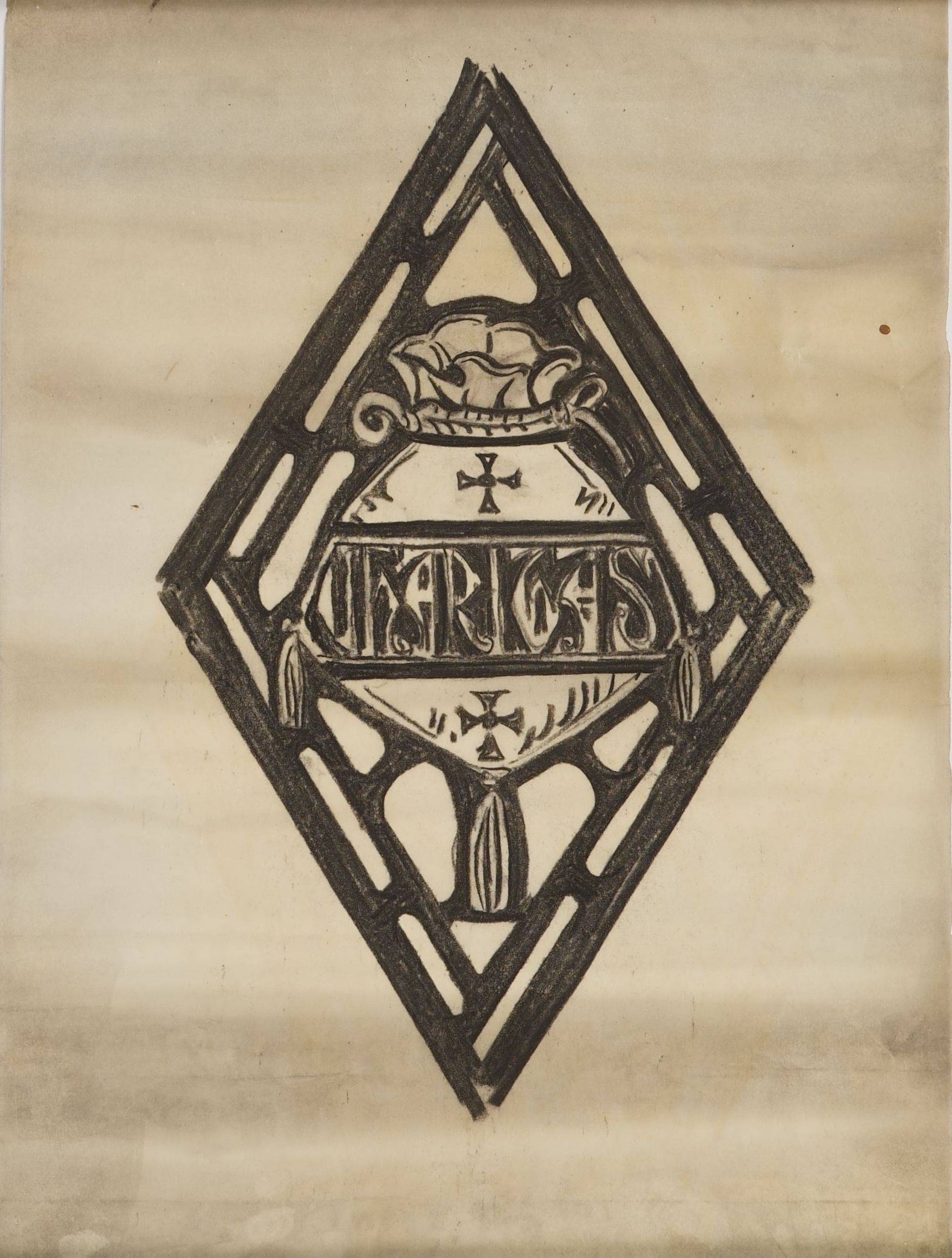Stained glass scale cartoon, window medallion for unknown site. Depicts a coin pouch with the word "CHARITAS" ("charity") written on it.Type of Drawing