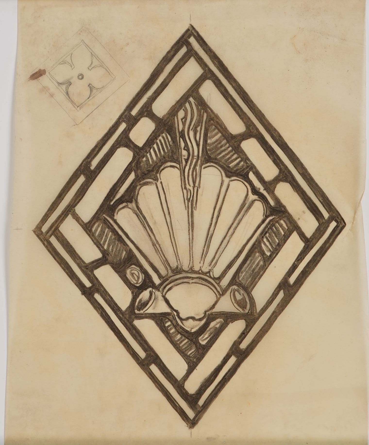 Stained glass scale cartoon, window medallion for unknown site. Depicts a shell, representing Baptism.Type of Drawing