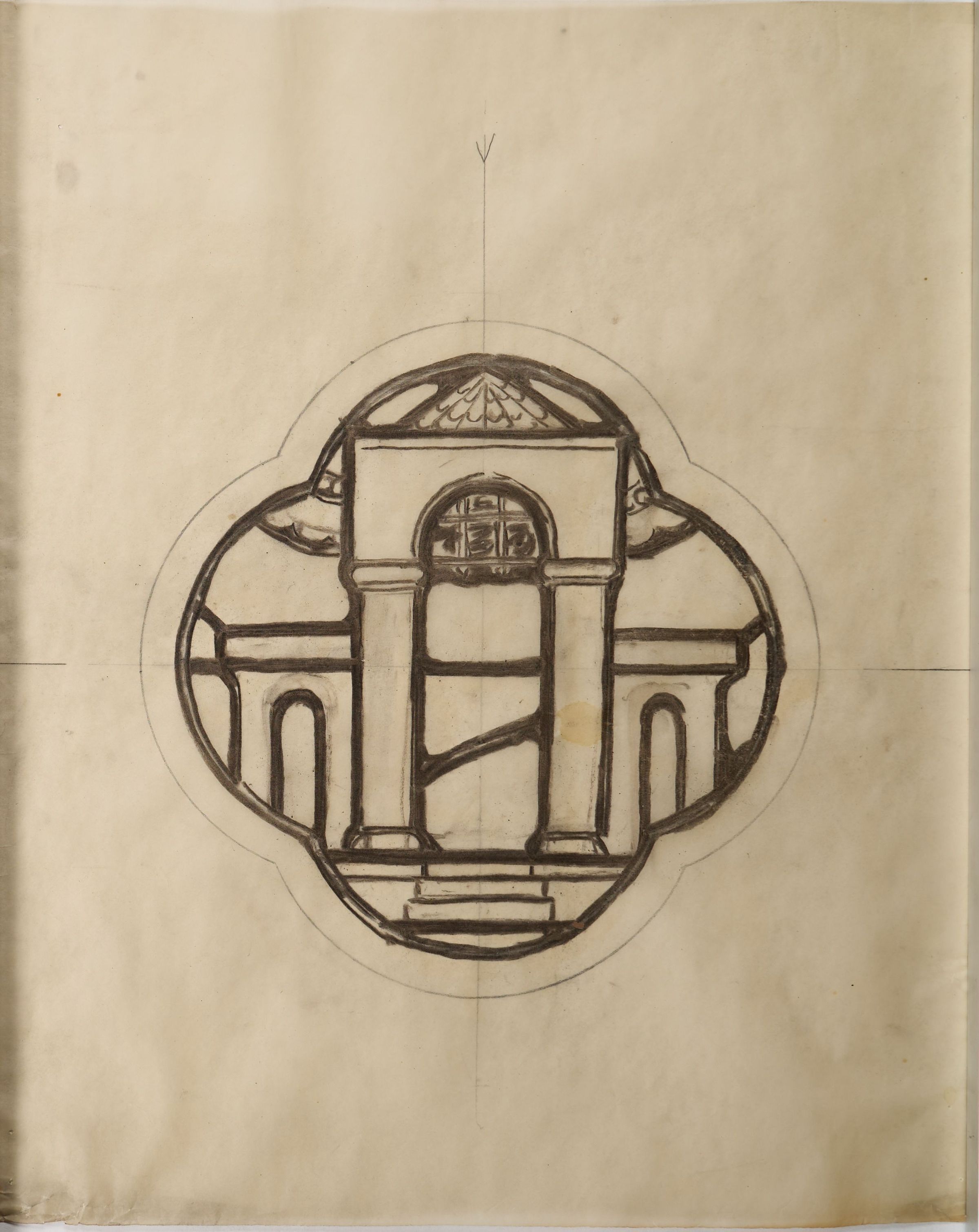 Stained glass scale cartoon, unknown site. A medallion depicting a temple.Type of Drawing