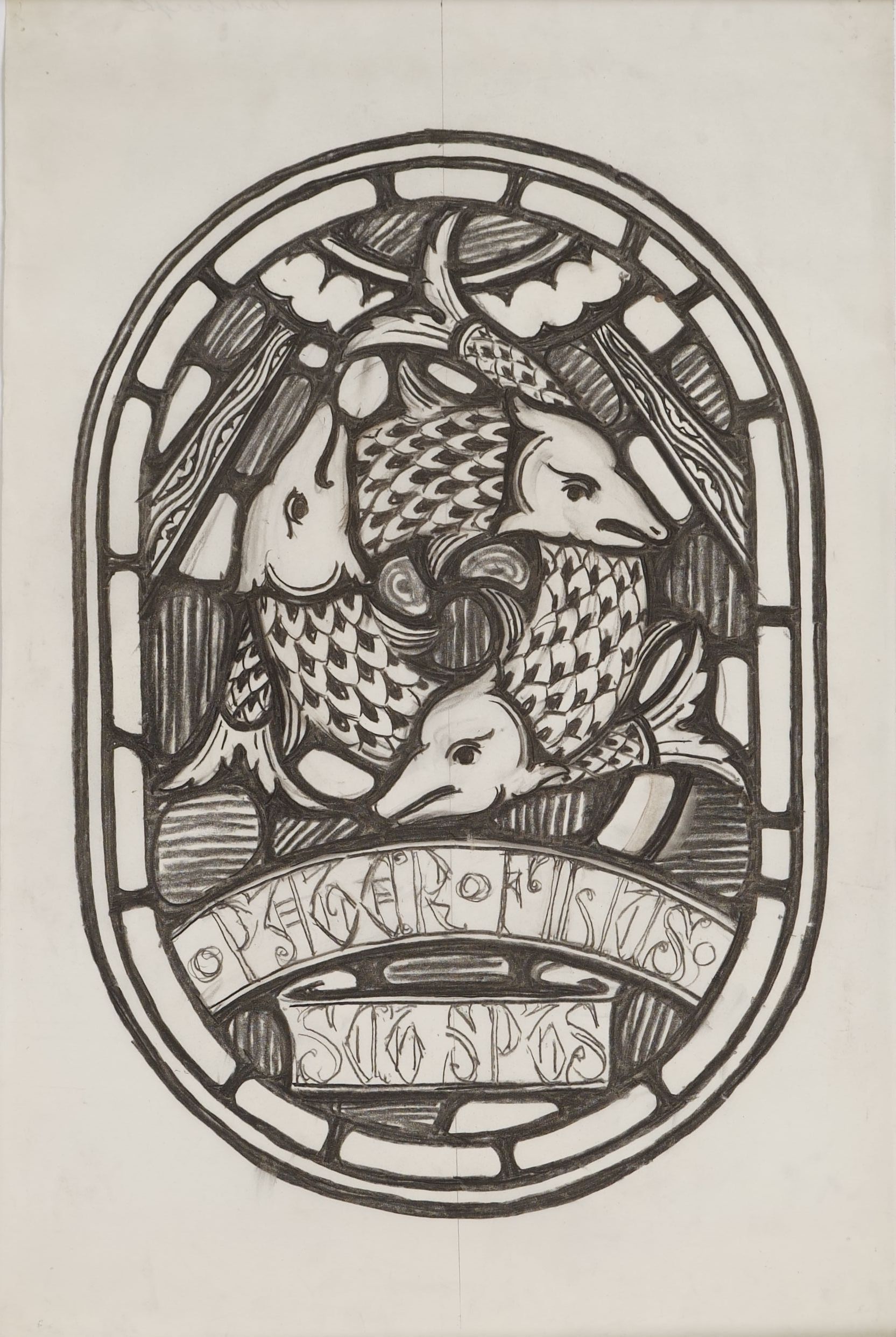 Stained glass scale cartoon; unknown site. A medallion; depicts a trinity, represented by three fish and the words "PATER FILIUS SCT SPUS". The last two words is an abbreviation for SPIRITUS SANCTUSType of Drawing