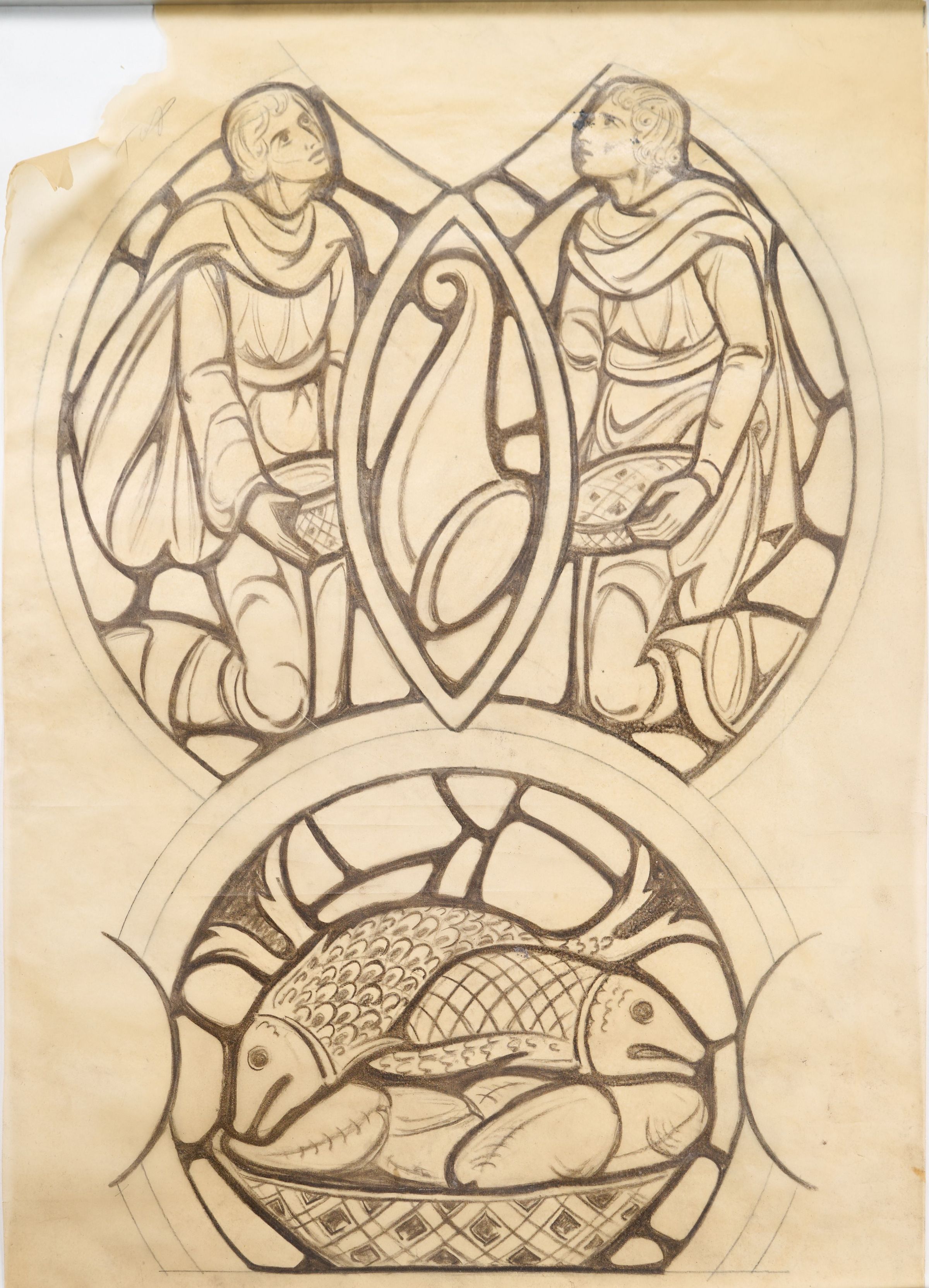 Stained glass scale cartoon, St. Mark's Episcopal Church, Toledo, OH aisle window. Window part depicting two men, a horn, and a basket with fish and loaves.Type of Drawing