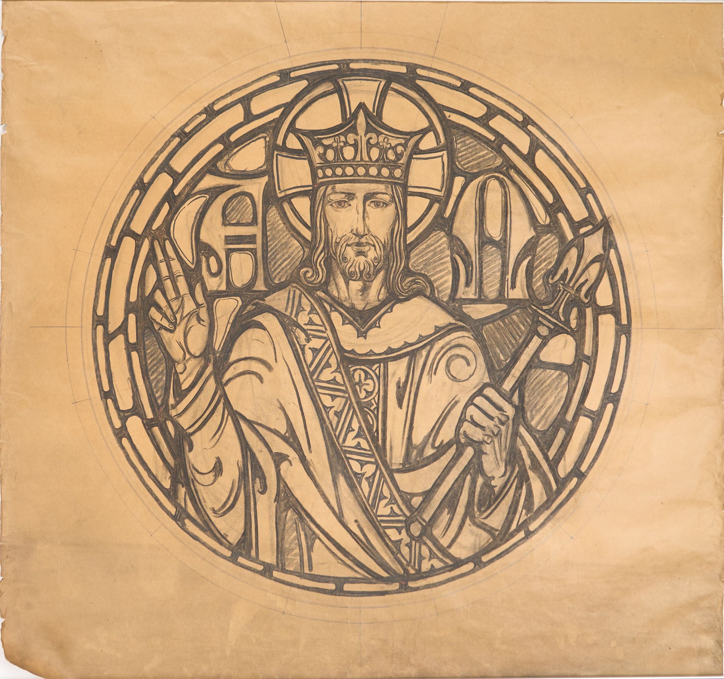 Stained glass scale cartoon; unknown site. Roundel depicting Christ the King holding a scepter and wearing a crown.Type of Drawing