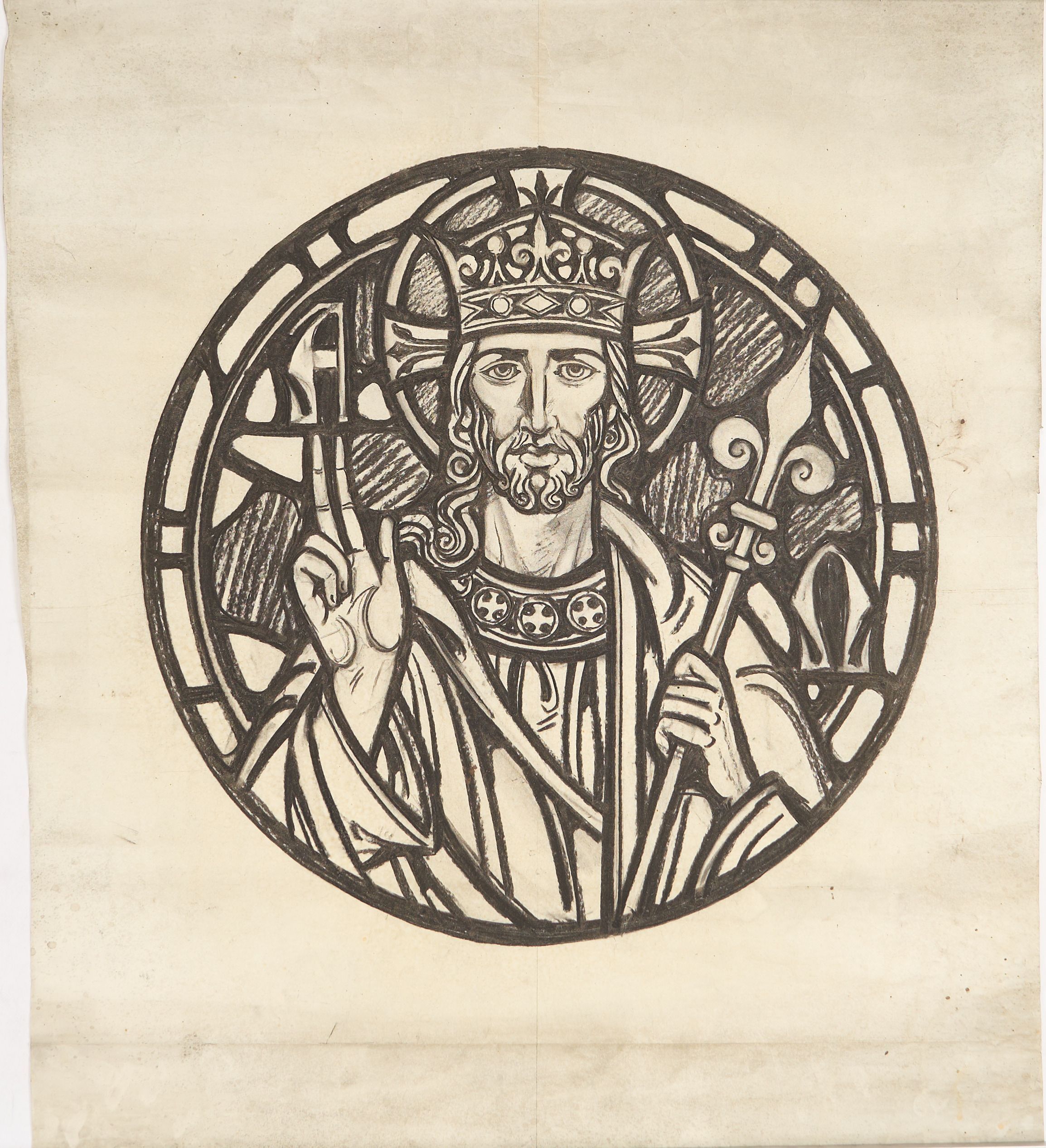 Stained glass scale cartoon; unknown site. Roundel depicting the Christ the King wearing a crown and holding a spear.Type of Drawing
