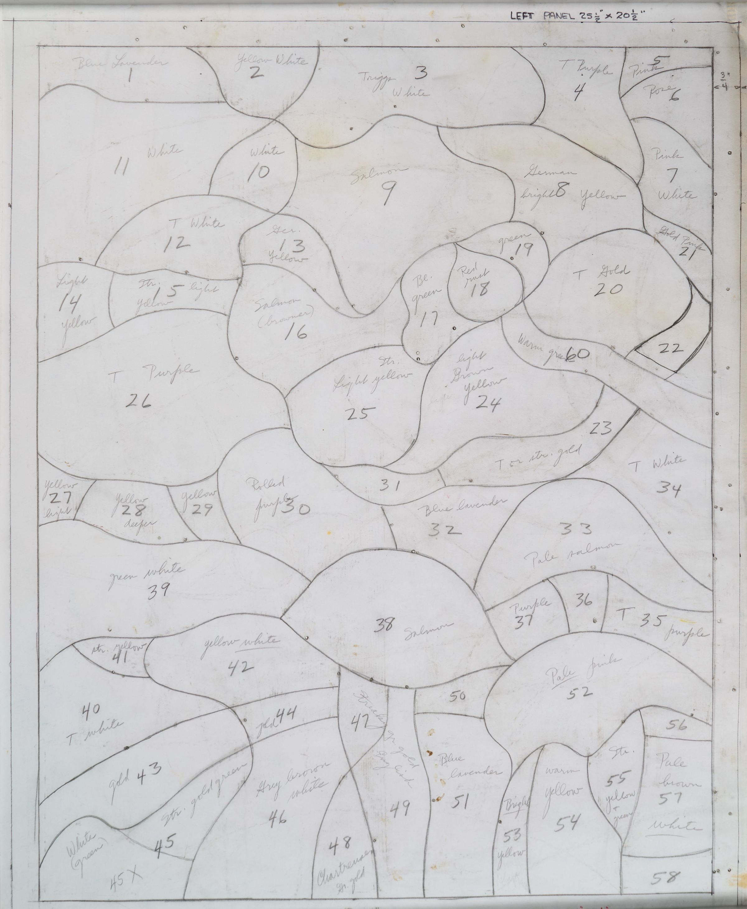 Stained glass scale cartoon; unknown site. A later Louise Pitassi Ellis panel. Each area that represents a piece of glass is labeled with a number and color. The borders of the drawing have measurements. Depicts flowers.Type of Drawing