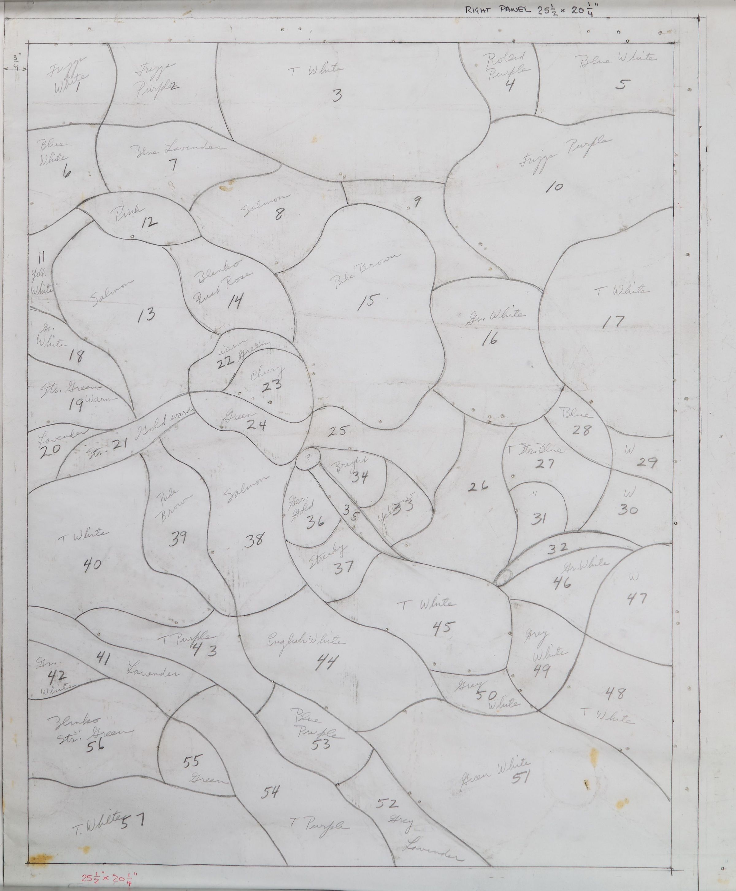 Stained glass scale cartoon; unknown site. A later Louise Pitassi Ellis panel. Each area that represents a piece of glass is labeled with a number and color. The borders of the drawing have measurements. Unknown depiction.Type of Drawing