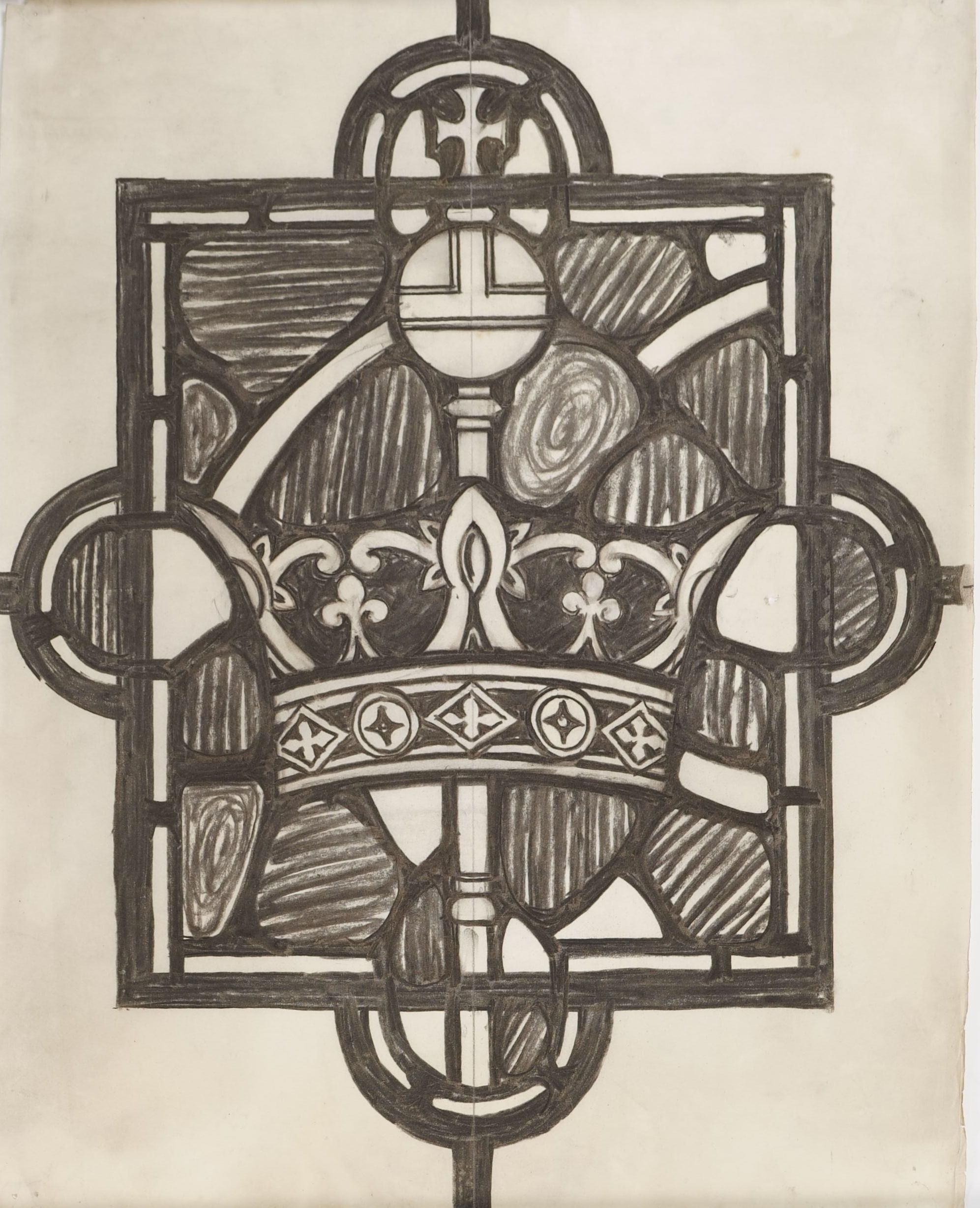 Stained glass scale cartoon, unknown site. Medallion for window, depicting a crown and scepter.Type of Drawing