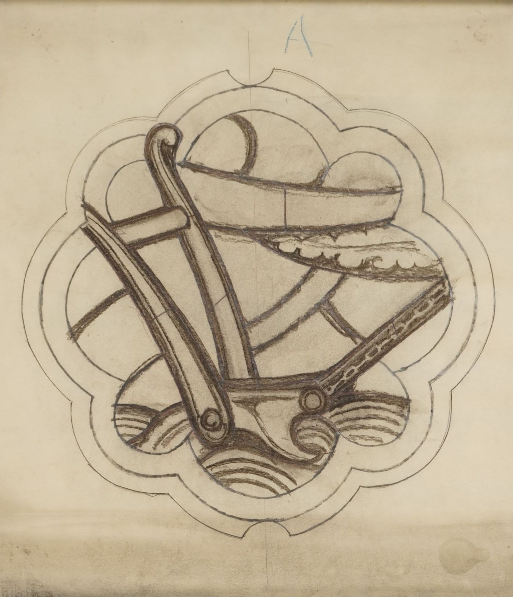 Stained glass scale cartoon, unknown site. Medallion for window, depicting a plow.Type of Drawing