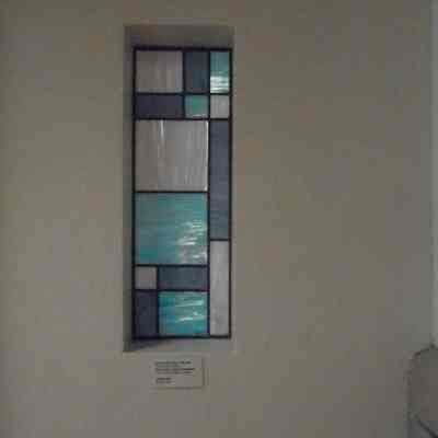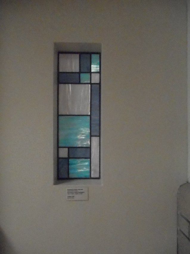 Stained Glass installation in the wall accross from Dean Kaylors office. Geometric design created by two artist. Katlyn Andyjohn created the design and Michael Antonacci executed it in the form of stained glass.Artwork Details