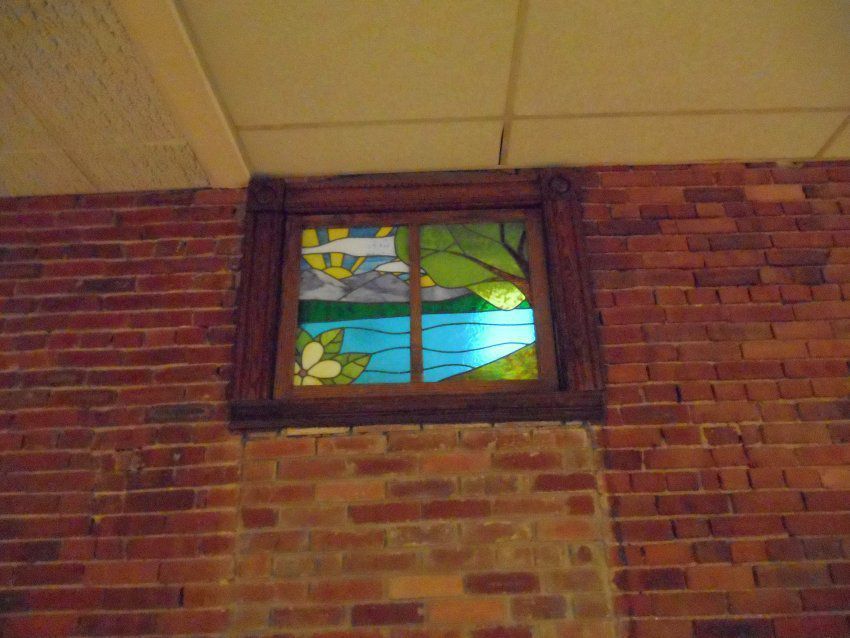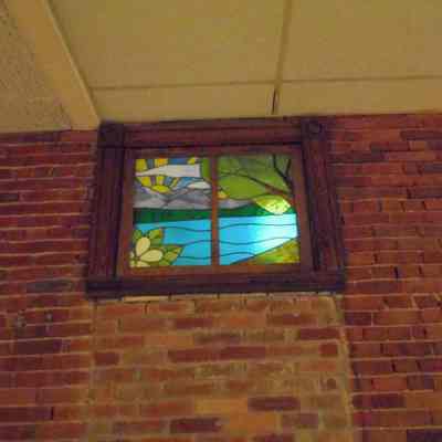 Stained glass depiction of a landscape. Mountains, lake and sunrise in the background with tree and flowers in foreground. Left of Executive Vice Presidents Office.Artwork Details