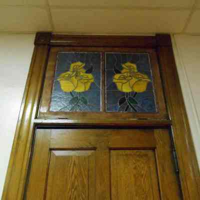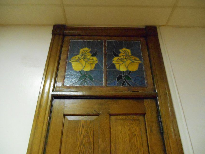 Yellow roses depicted in stained glass. Left of Residence LifeArtwork Details