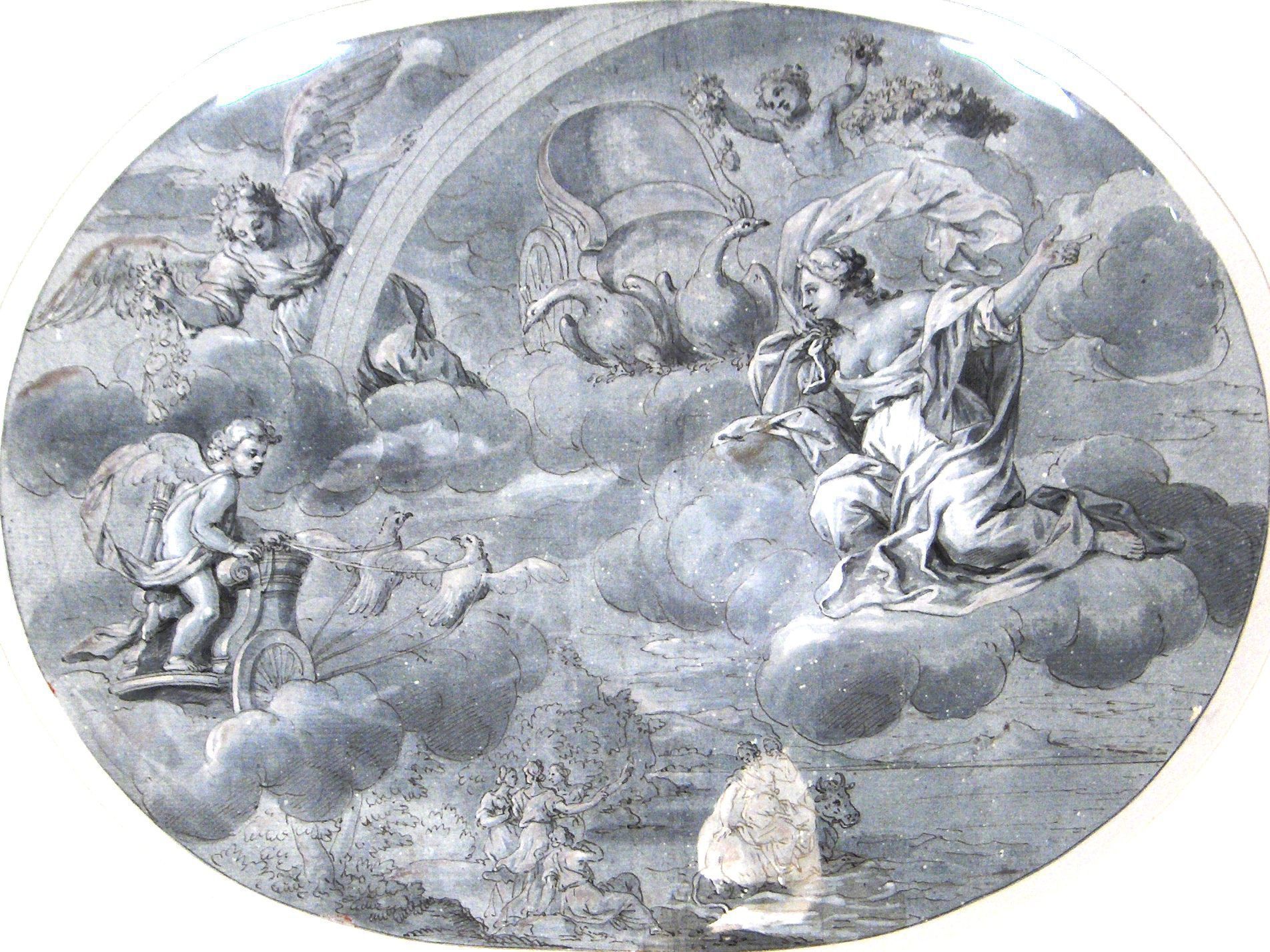 Venus and Cupid are shown with Iris, the goddess of the rainbow and messenger of the Olympian gods. The scene at the bottom of the picture is the abduction of Europa by Zeus, who has disguised himself as a white bull. There are a total of six such works in the Saint Vincent Art Collections. They appear to be by the same hand, and all of them appear to be either drawings of existing ceiling murals, or drawings for proposed murals. A strong argument can be made that they are proposals by comparing the remarkable similarity of the main composition and the slight variations in the details.