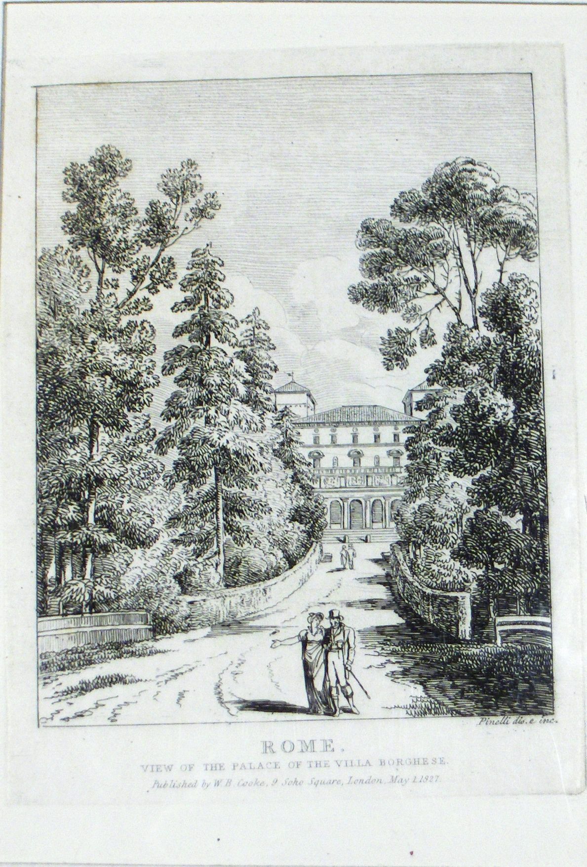 Engraving, Artwork, Ink, View of the Palace of the Villa Borghese, Trees, Path, Villa, Palace, 19th Century, Couple, Stroll, Rome, W.B. Cooke, Bartolomeo Pinelli, Twenty Five Views in Rome and its Vicinity, Engraving, Artwork, Ink