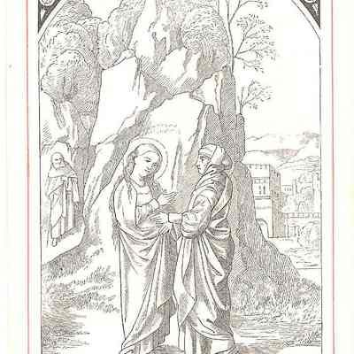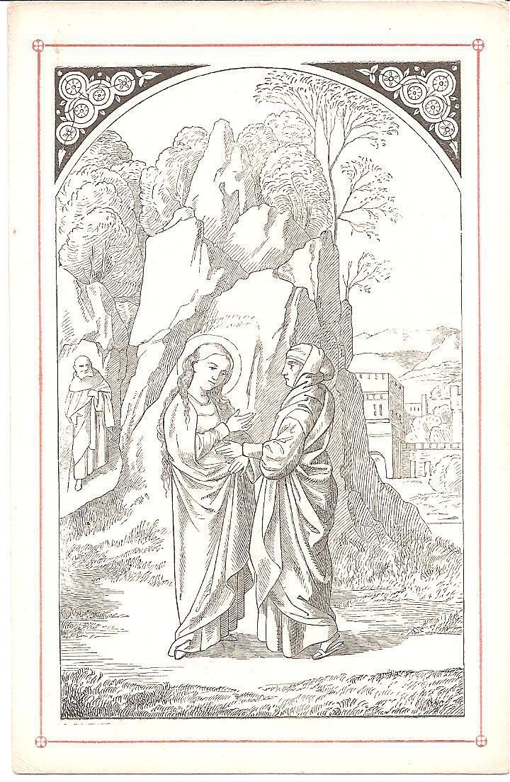 This is a reproduction of a 16th century engraving of the visitation of the Blessed Virgin Mary and Saint Elizabeth. Mary had found out about the annunciation of Elizabeth and how she is 6 months pregnant so Mary traveled to go see her. Mary in on the left side and Elizabeth in on the right. They are standing in front of a cliff made of stone.Collection