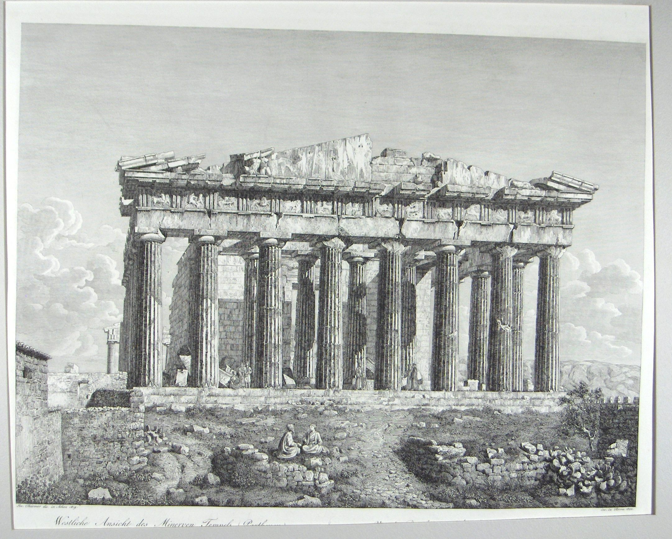 Engraving, Artwork, Ink, Exterior of the Parthenon, Athens, Landscape, Greece, Ruins, Mountains, Columns, Parthenon, Rubble, Engraving, Artwork, Ink