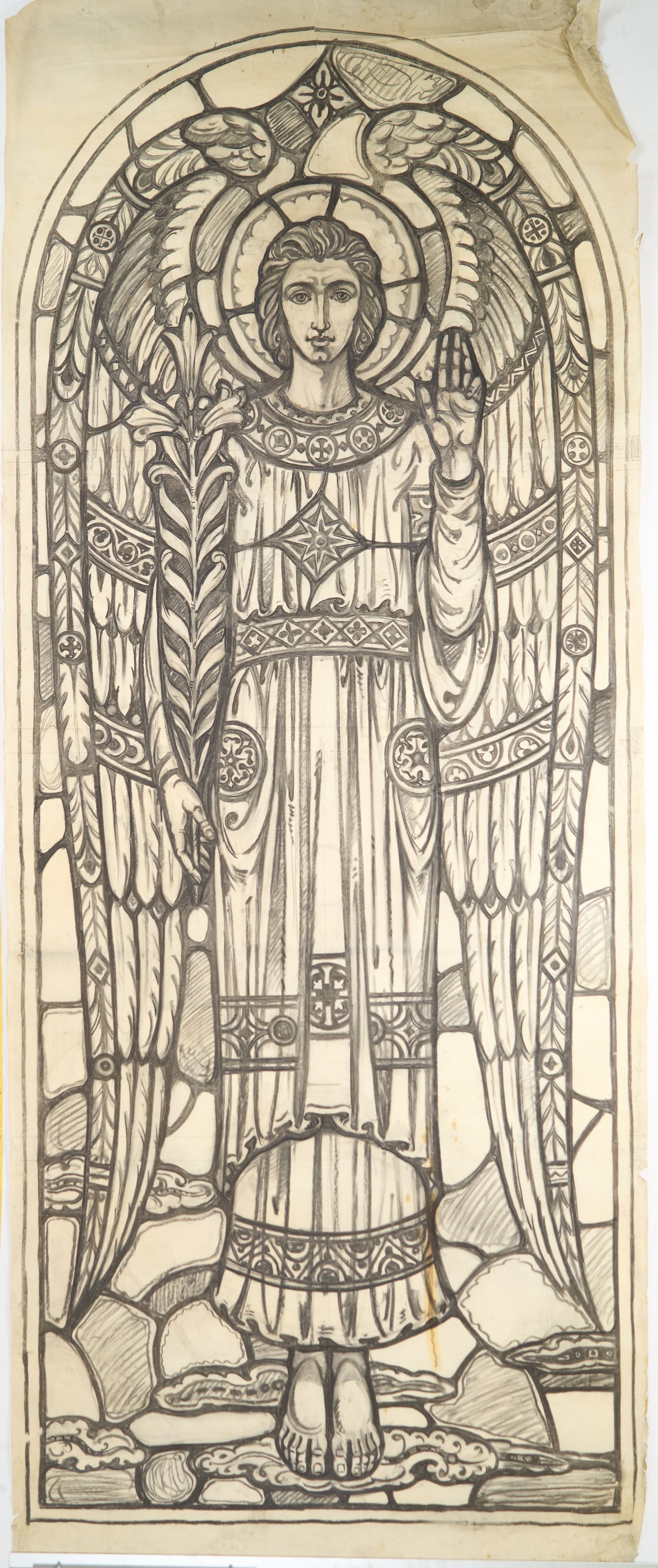 Stained glass scale cartoon, crossing window for Cathedral of St. Joseph in Wheeling, WV. Depicts the Archangel Gabriel holding a lily, alluding to the annunciationType of Drawing
