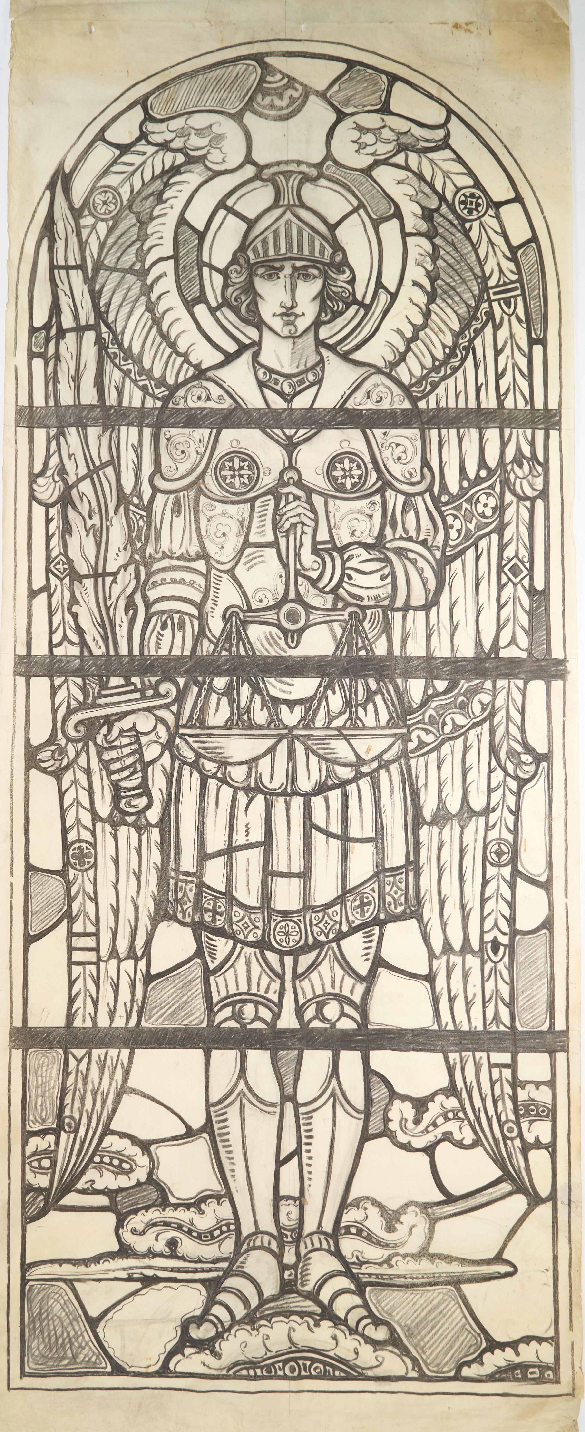 Stained glass scale cartoon, crossing window for Cathedral of St. Joseph in Wheeling, WV. Depicts the Archangel Michael dressed in knight's armor, holding a sword and scales.Type of Drawing