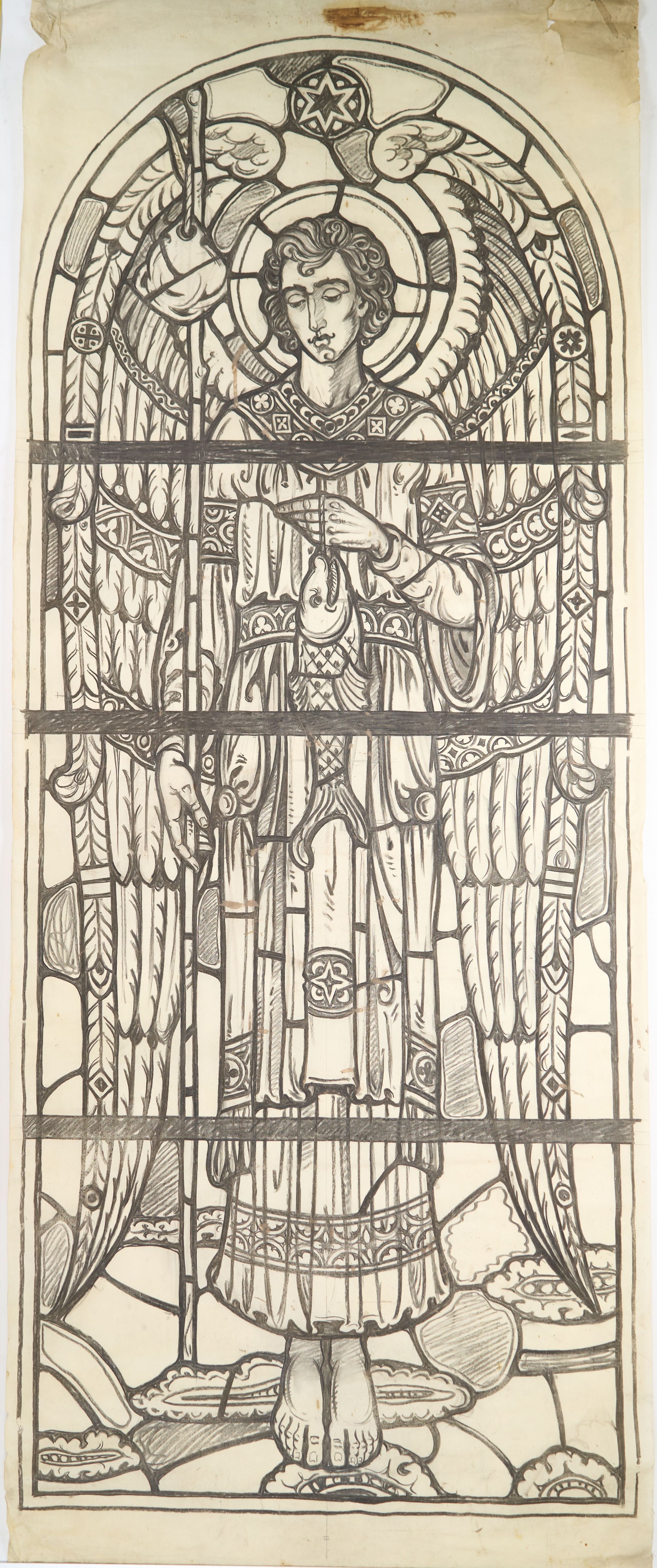 Stained glass scale cartoon, crossing window for Cathedral of St. Joseph in Wheeling, WV. Depicts the Archangel Raphael holding a staff and a fish, alluding to the Book of Tobit.Type of Drawing